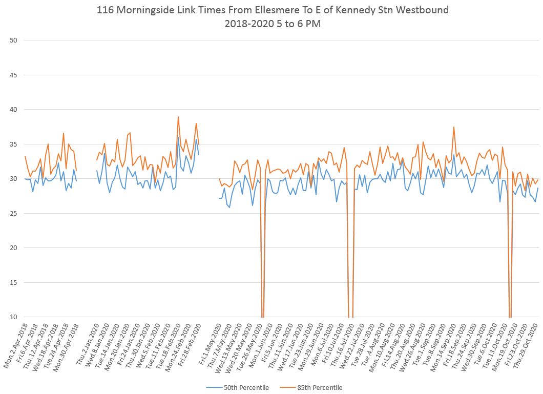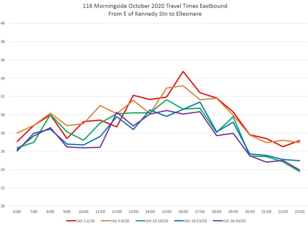 Unlike the Scarborough route, 116 Morningside has no express service, and so the speeds for all vehicles both pre and post-Covid are for local services.