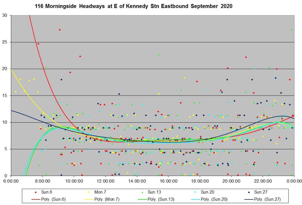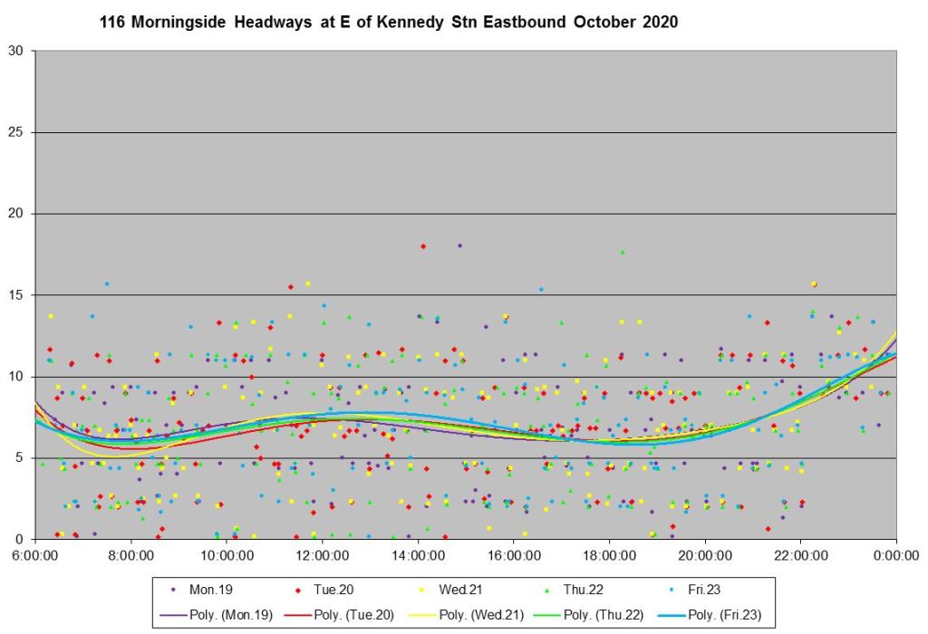 Saturday shows the same problem, but with a wider range of headways. The problem evident in September is also obvious in October.