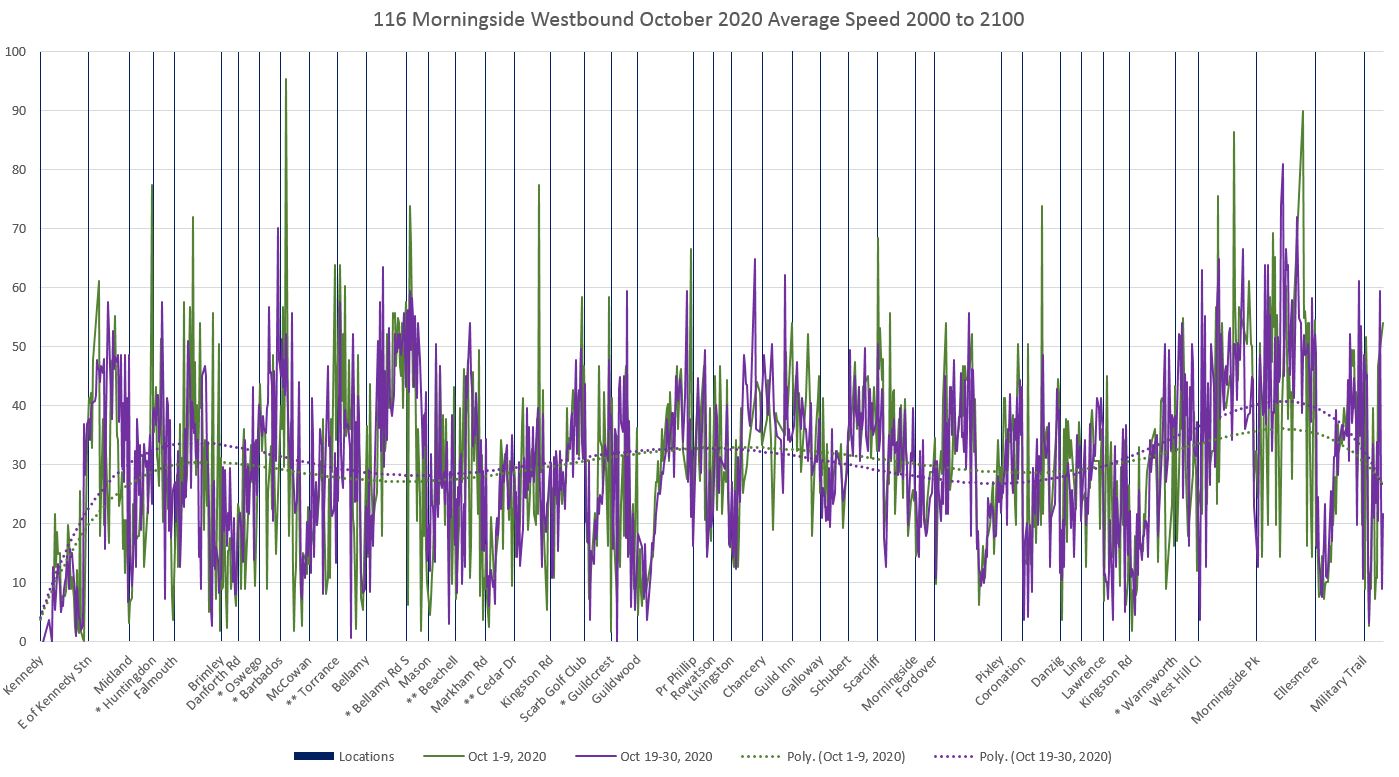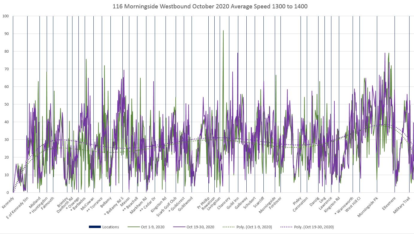 These charts compare the average speed of vehicles along the 116 Morningside route between Kennedy Station and Ellesmere for weekdays from October 1-9 (pre-PRT) and October 19-30 (post BRT). In the chars the data are green and purple respectively for the two periods.