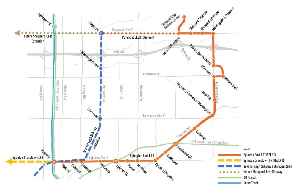 A vestigial Sheppard East LRT is included linking the new terminus at Sheppard/McCowan east to the proposed Malvern leg of the Eglinton LRT.
