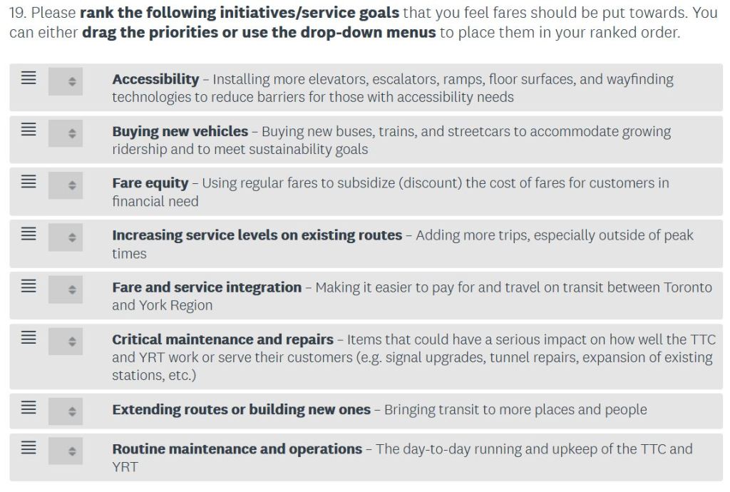 Of particular note here is that the dollar value of each type of work is not shown, and so a respondent has no way to know what the effect on fares would be if these items were charged to fare revenue.