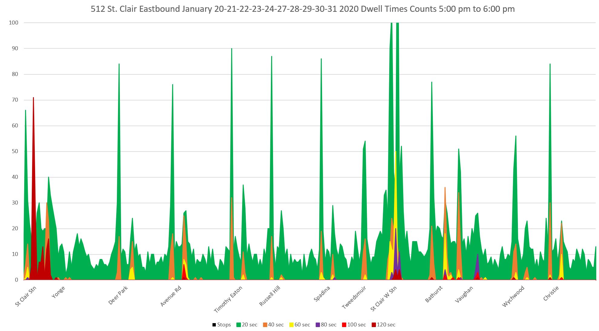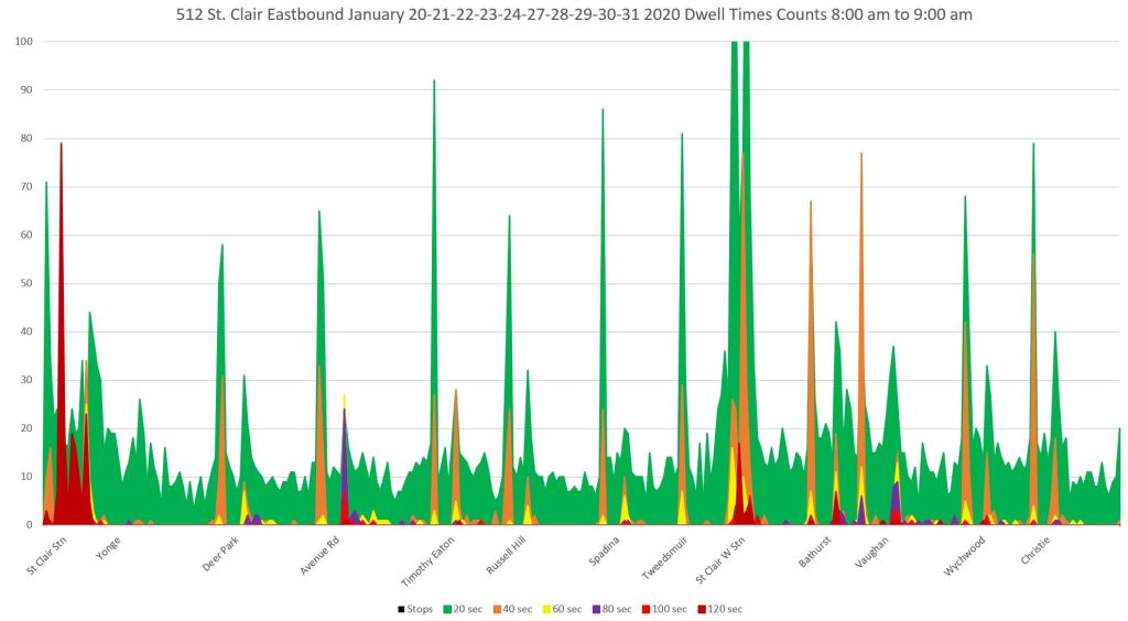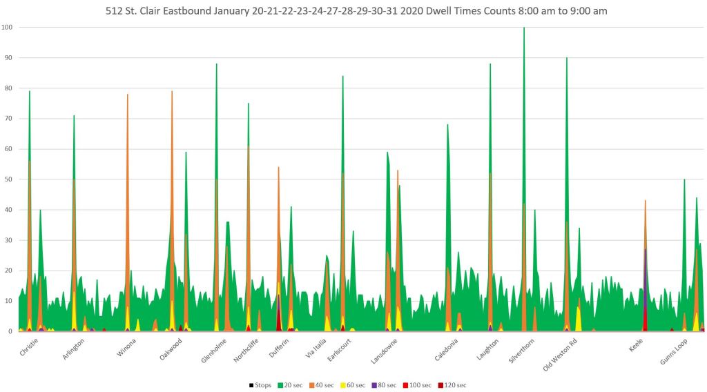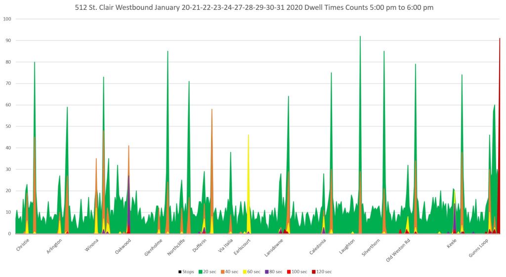The charts below show the dwell time profile for 512 St. Clair westbound in the PM peak hour. The data are from the last two weeks of January 2020, pre-pandemic, and without any major winter storms.