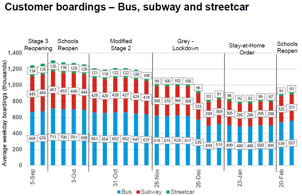 “Boardings” or “unlinked trips” count each leg of a journey separately. Any transfer between vehicles (except on the subway) counts as a new boarding. While all modes suffered a downturn through the fall and winter, the bus network did best of the three showing its relative importance to riders who continue to be on the TTC.