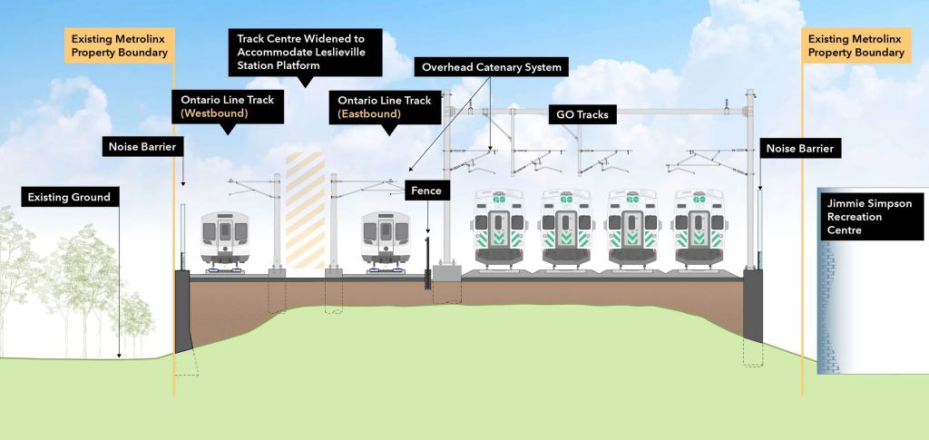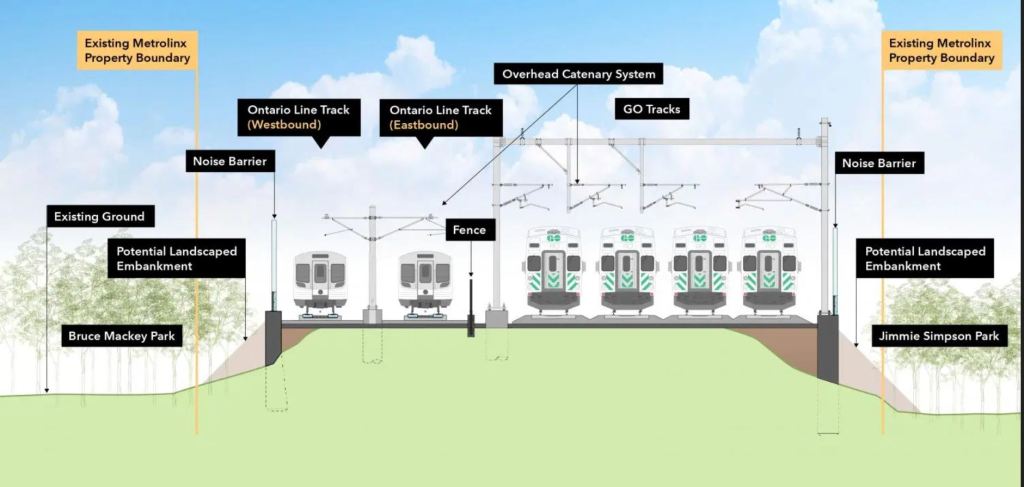 Metrolinx claims that noise walls and quieter electrified train service will result in noise levels that will actually be lower in most areas in the community. They say that “Ontario Line trains will be quieter, electric-powered trains and many GO trains will also be electric-powered”. This is a correction from earlier public consultations where they claimed that all GO service would be electrified. (Only about half of the LSE service will be electric with the Bowmanville extension running with diesels.)