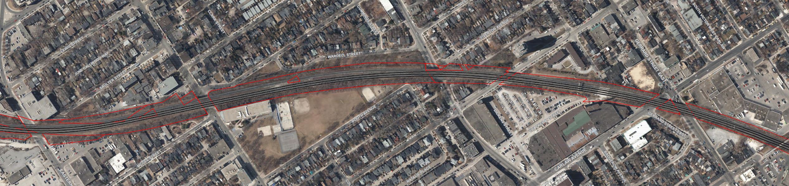 - The Jimmie Simpson Centre (lower left of the image) is right at the Metrolinx property line.