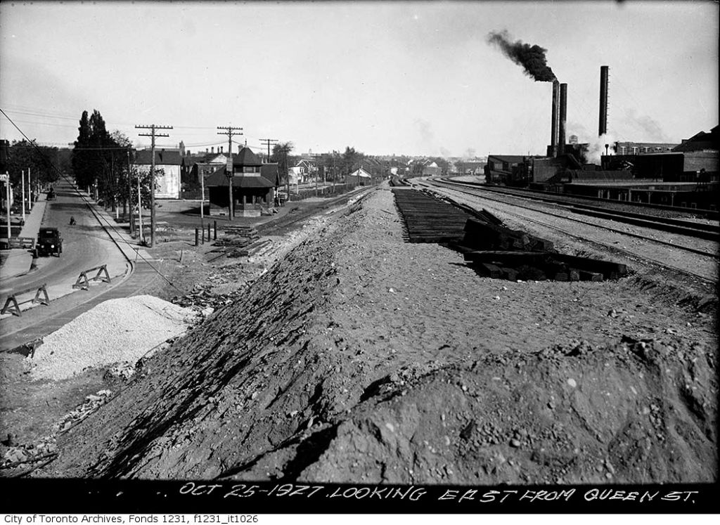 Another way to understand where the boundaries lie is shown in this photograph of construction of the rail corridor. The street on the left is DeGrassi, and this shows how far the railway corridor extended into what is now thought to be parkland.