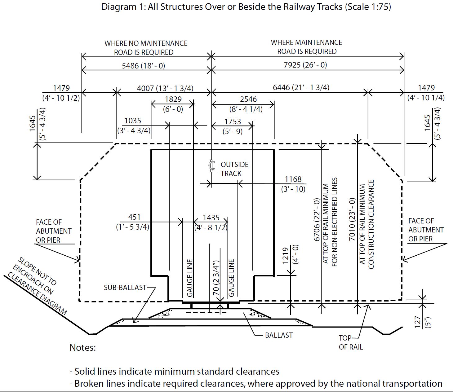 The federal standards are shown below. Note that there is an 18-foot (5.486m) separation required between the track centre line and any adjacent structure. This is considerably smaller than the spacing shown in the diagram above. The Metrolinx diagrams are silent on spacing to fixed structures such as buildings, as opposed to vegetation which can grow into the rail corridor.