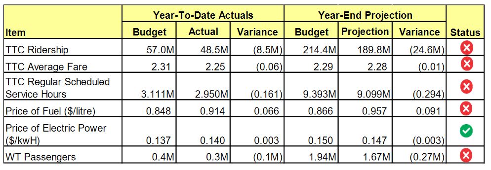 Note that the TTC projects it will schedule about 3 per cent less service hours over the year than originally planned, and for the year-to-date has actually scheduled about 5 per cent fewer hours than budgeted due to lower than expected demand. This falls more heavily on the subway which is operating at 87 percent of normal service levels, while bus and streetcar services are at 97 and 95 percent respectively.
