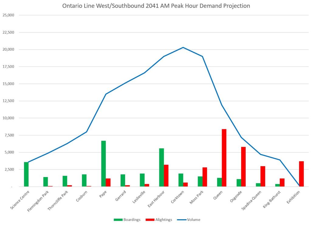 The stations might be a nice place to visit, but the real purpose of a transit line is to move people. For that, an important planning question is how many people actually want to ride in the peak period.