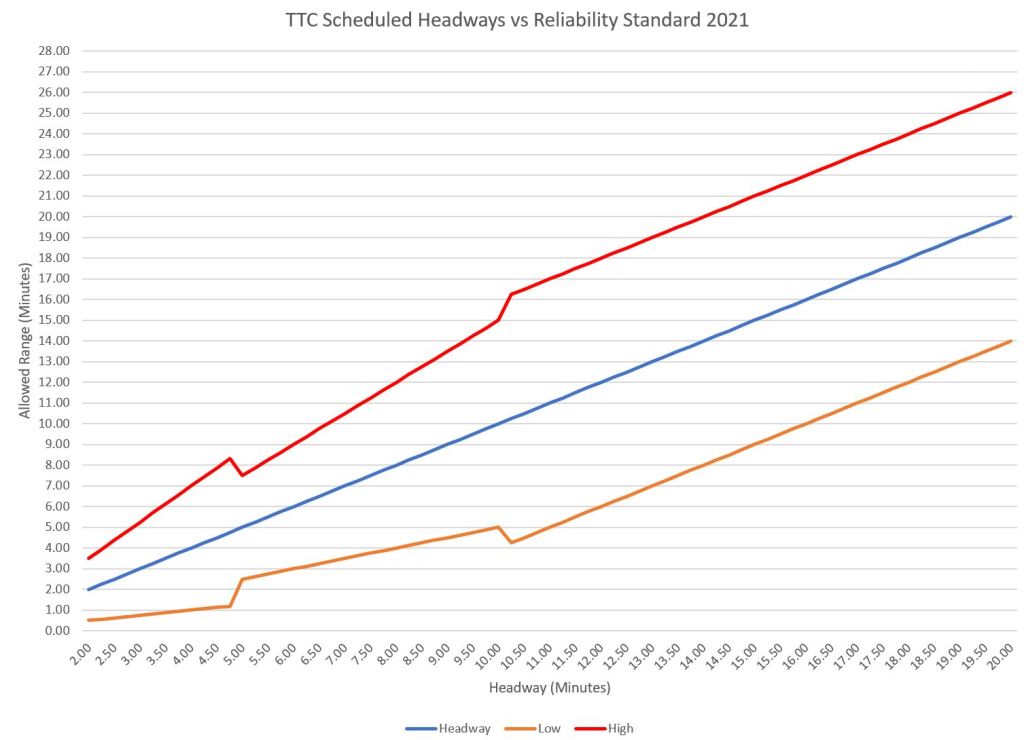 There are notches in the red and orange boundary lines corresponding to transitions between the TTC Standards for short, medium and long headways. The common point, however, is that the standards allow a wide range of headway values compared to what is advertised. They can claim to be providing “reliable” service within those standards while riders experience nothing of the sort.
