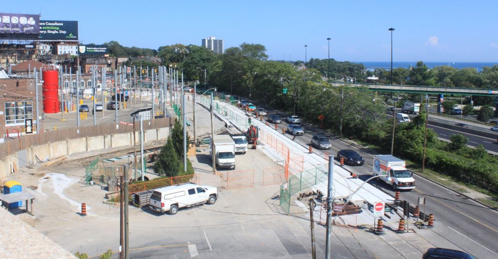 In the foreground, the new leads to Sunnyside Loop are mostly completed within the streetcar lanes on The Queensway, but the majority of the new loop has not been installed. In the background, the leads to Roncesvalles Carhouse are now in place across the westbound road lanes and connected to trackage within the yard.