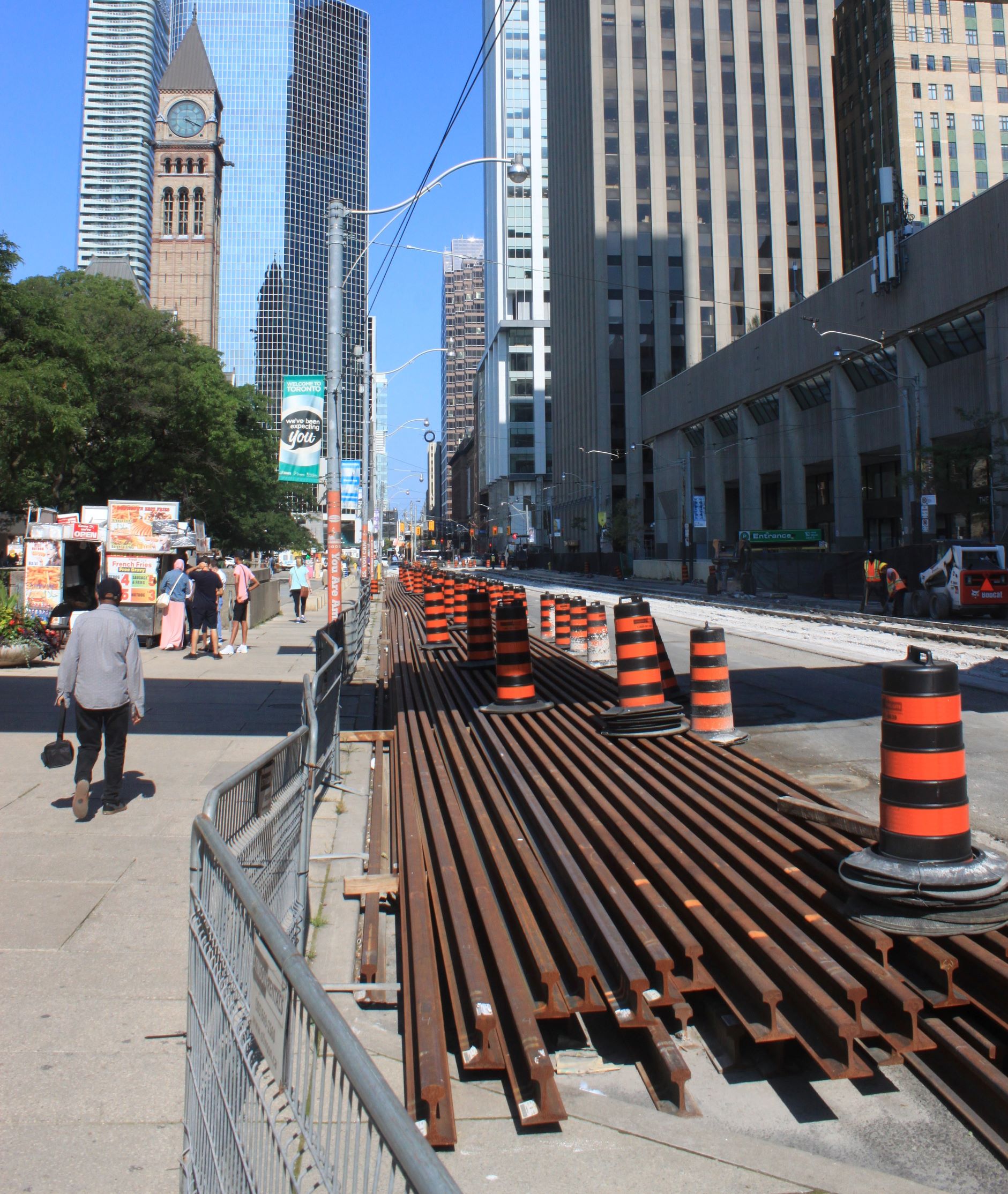 Pre-welded strings of track sit in the north curb lane (usually occupied by a fleet of fast food vendors and tour buses). A companion inventory sits in the north curb lane at Trinity-Bellwoods Park for the west end of the project.