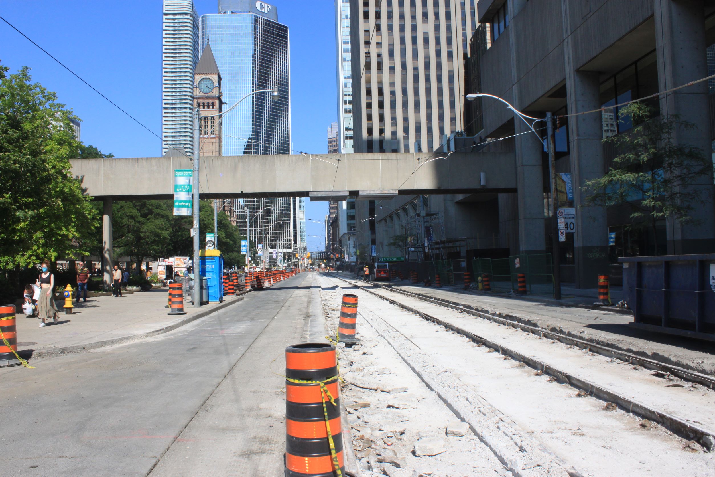 Work will continue westward from University to Spadina in stages, and then will jump to the west end of the project at Fennings and work eastward. There are no announced dates for future stages nor details of service arrangements for buses and streetcars.