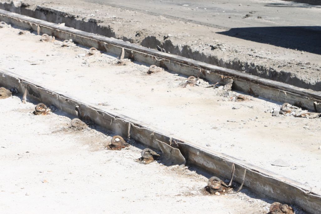 Because this track was rebuilt two decades ago with a new foundation, concrete ties and Pandrol clips holding the track in place, the excavation only needs to remove the surface layer. The old track will be replaced and new rails clipped onto the existing base. Also visible below is the rubber sleeve for vibration isolation that was wrapped around the old track.