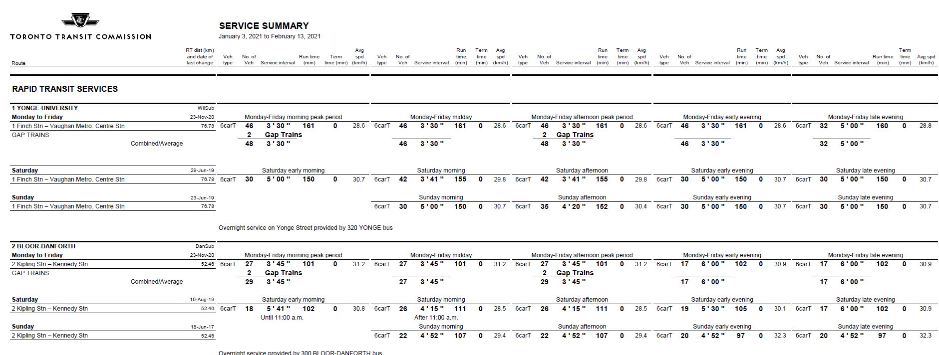 The TTC has provided an update on their service for the next few months as shown in the table below.