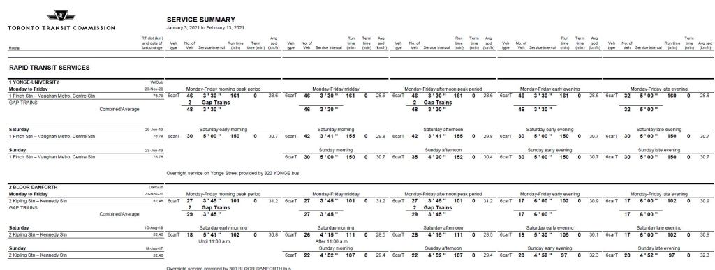 Another source of scheduled service information is the electronic version of schedules that are published on the City of Toronto’s Open Data site by the TTC. Without going into the mechanics of reading these, they clearly show the 3’30” and 3’45” headways advertised above for Lines 1 and 2 respectively.