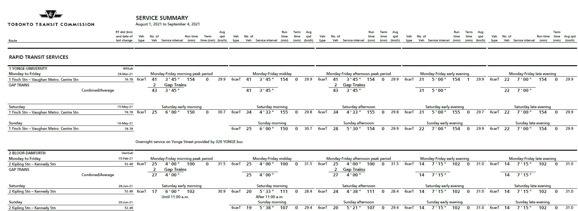 Source: Email from Mark Mis, Head of TTC Service Planning, September 9, 2021