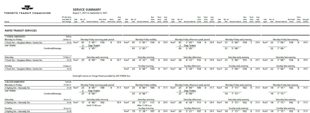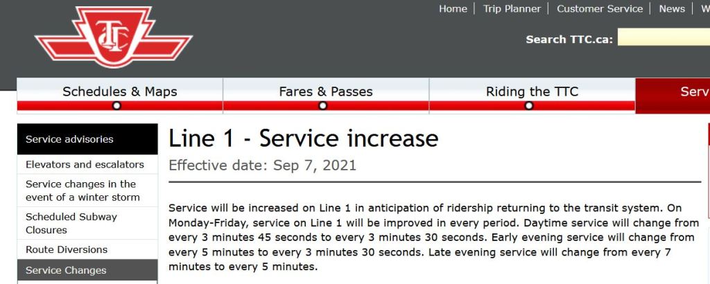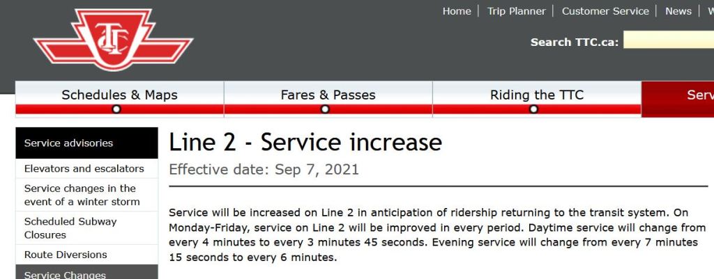 Source: TTC Website copied September 7, 2021Source: TTC Website copied September 7, 2021