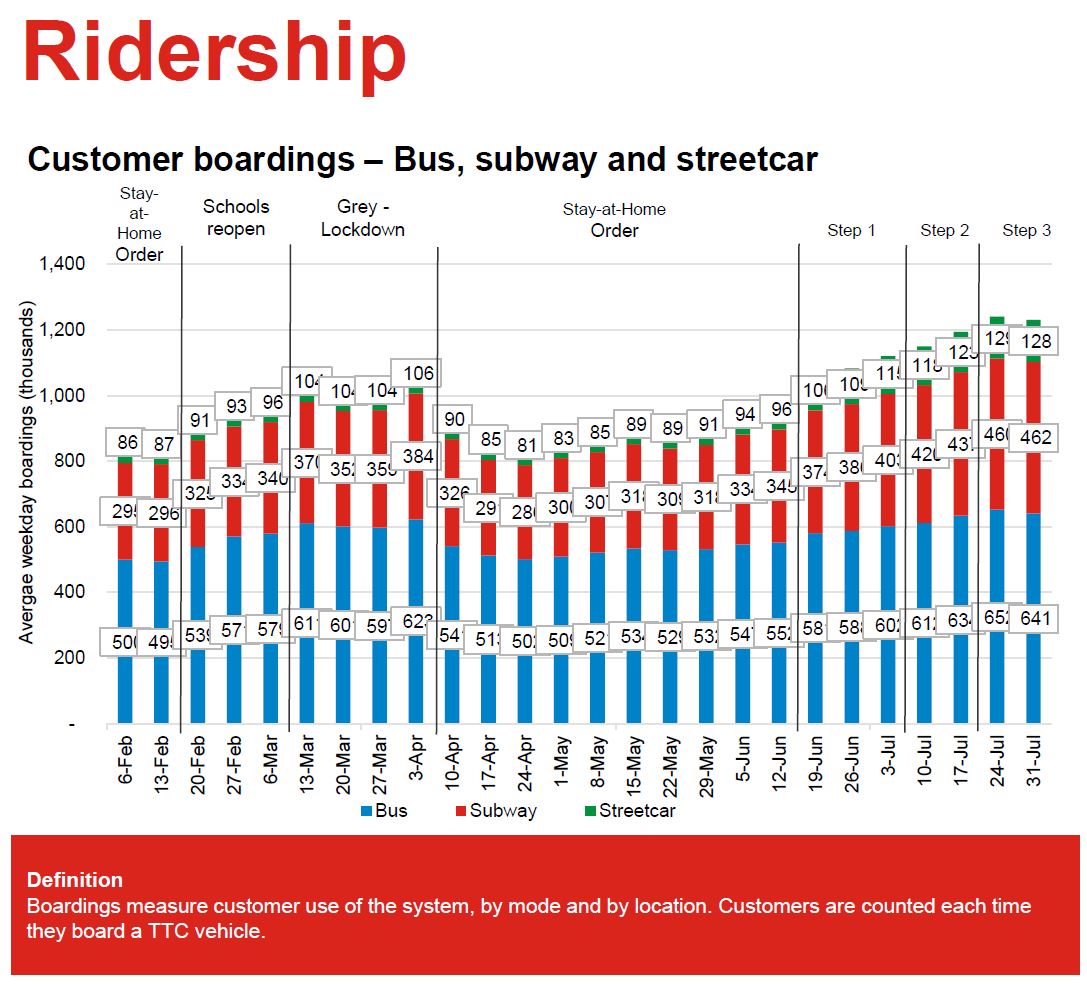 Ridership is growing slowly on the TTC with the largest changes, proportionally speaking, coming on the streetcar and subway systems that serve downtown. These modes are now at 31 and 37 percent respectively of pre-covid levels while the bus system is at 46 per cent as of July 31, 2021.