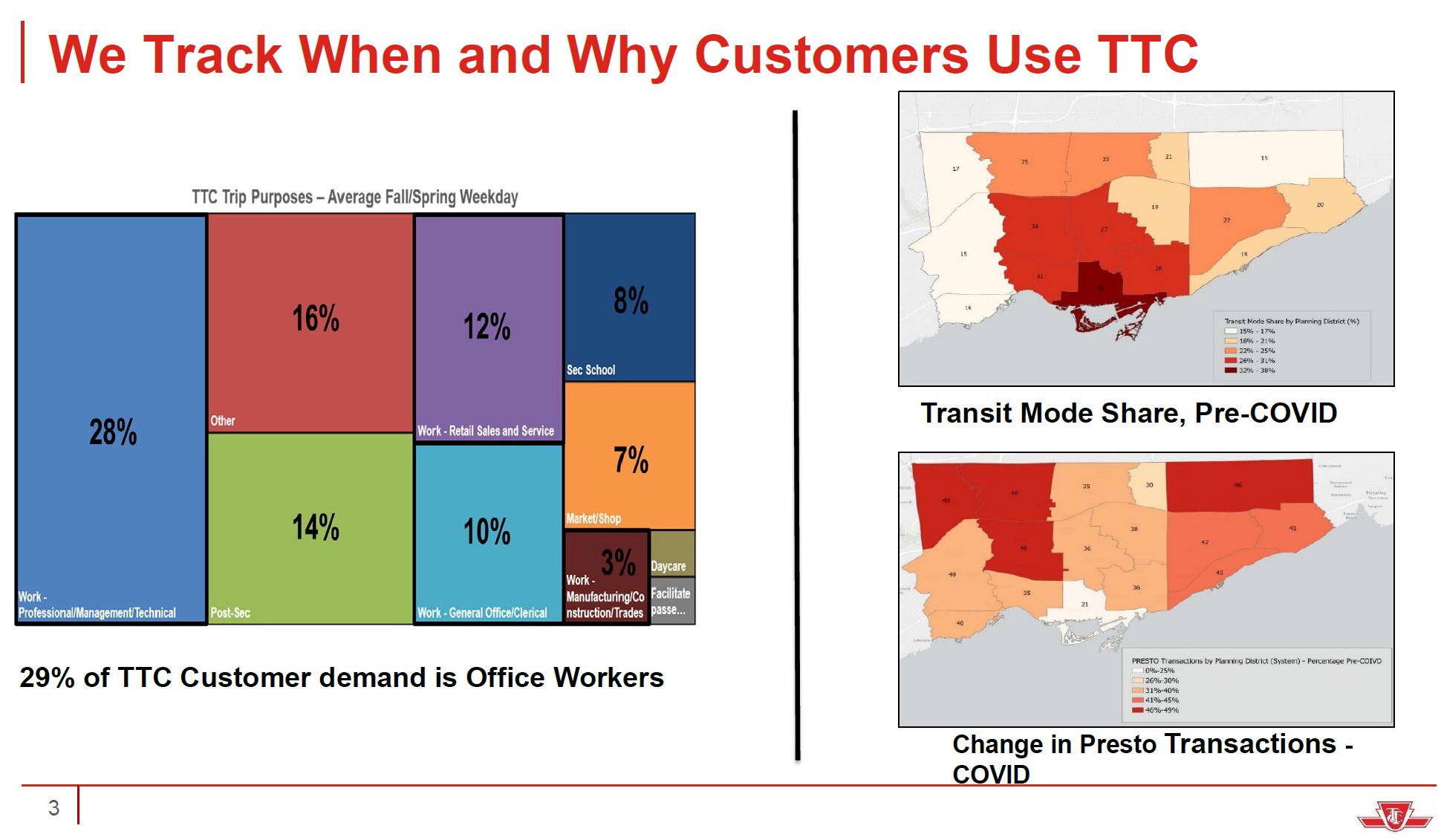 TTC Staff presented an overview of ridership trends and projections looking ahead to 2022 and 2023. An important part of looking ahead is understanding where the TTC was in pre-pandemic times. A great deal of planning and political effort focuses on commuters, especially those headed to the core area, but they are only part of the overall travel demand served by transit.