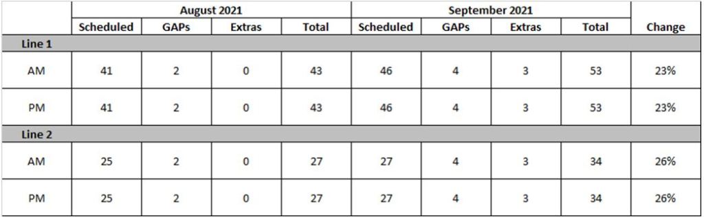 On both lines, there are five more unscheduled trains (gap trains and extras) in September than in August.
