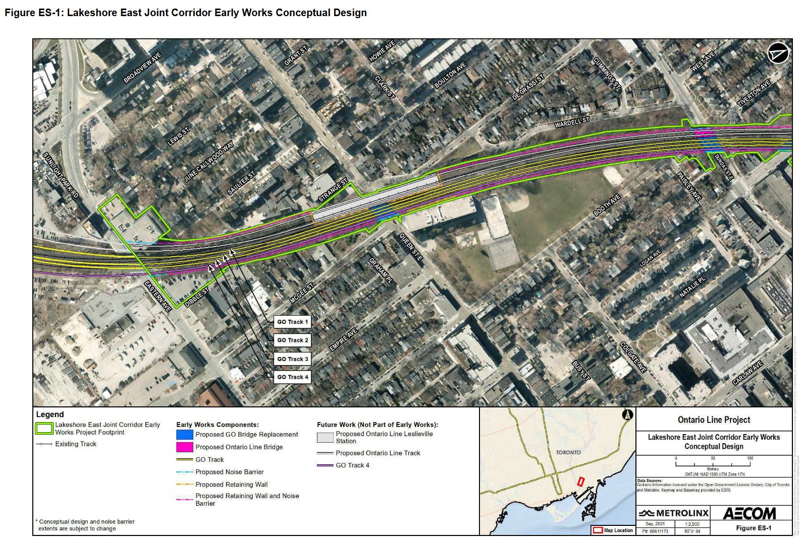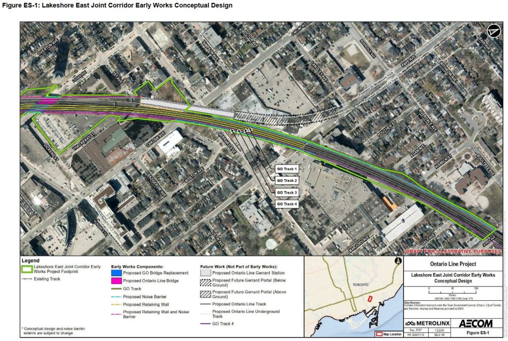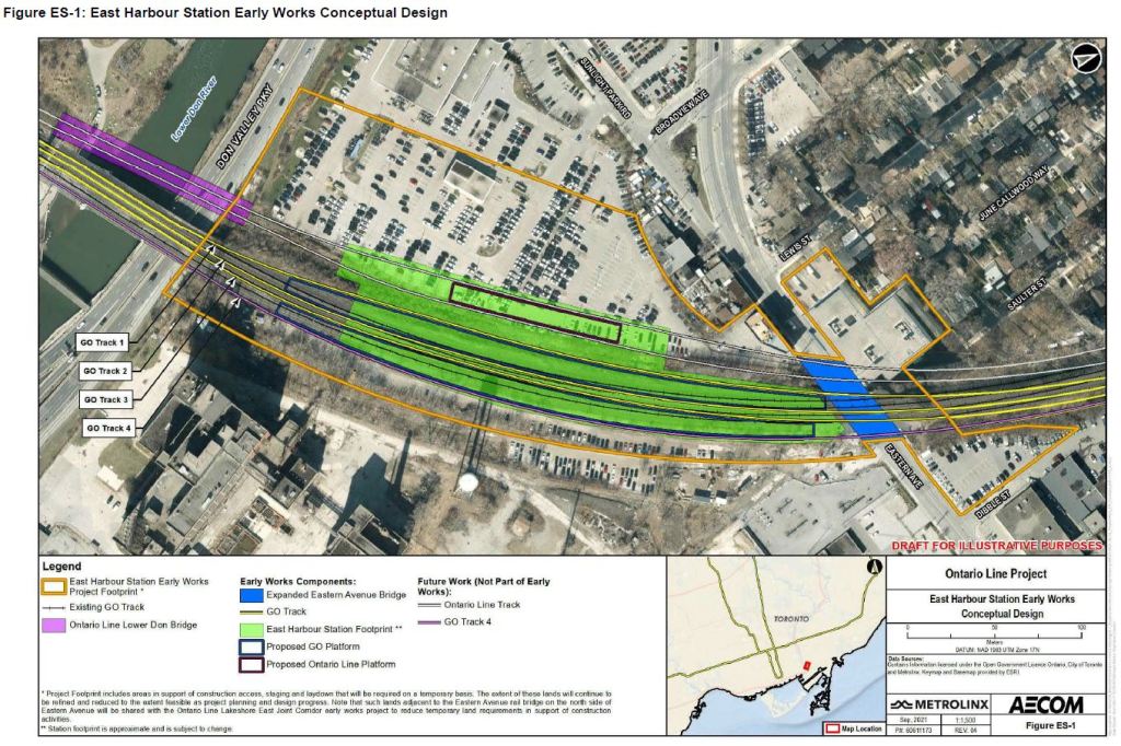 replacement and expansion of the existing Eastern Avenue rail bridge to accommodate four Lakeshore East GO tracks and two future Ontario Line tracks; and