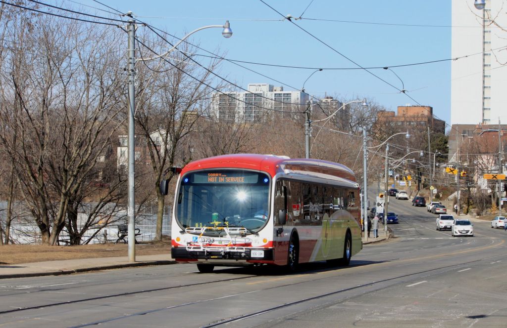 Service east of Russell Carhouse (effectively from Greenwood) on Queen to Neville Loop will be converted to bus operation during overhead conversion for pantographs. Initially streetcars will turn back from the carhouse while a 501N Queen bus operates from Neville to Lake Shore Garage (at Commissioners and Leslie) as a replacement service. In November, the TTC expects overhead conversion for pantographs will be complete far enough east that streetcars can operate through to Woodbine Loop, and the 501N will operate west only to Coxwell. This arrangement implies that 501 Queen will convert to pantograph operation.