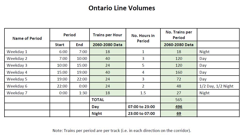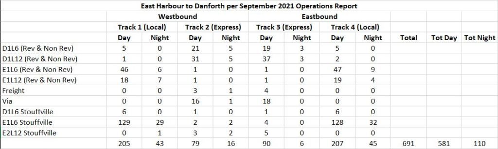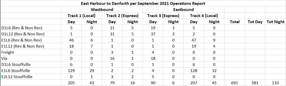 The grand total of trains on the expanded GO corridor will be 691 of which 581 will operate between 7am and 11pm, and 110 will operate between 11pm and 7am. (See LSE OnCorr Tracks, East Harbour to Danforth – Combined Table, p62.)