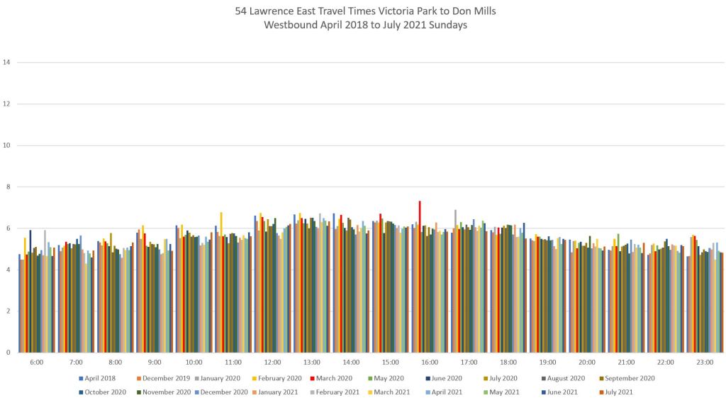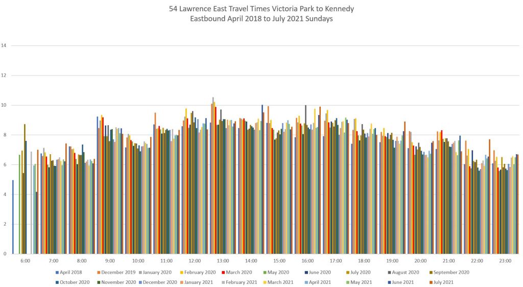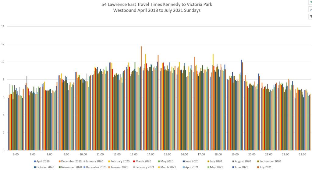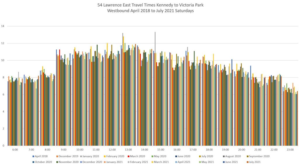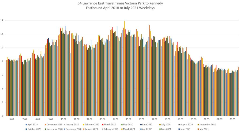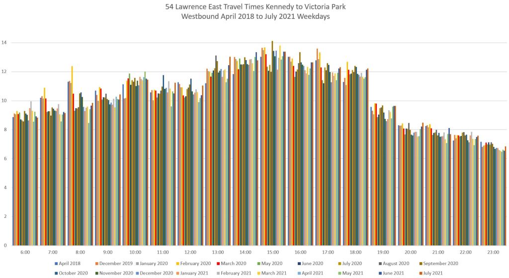 For the section west of Lawrence East Station, I have broken the analysis into two segments at Victoria Park because the Councillor for the ward west of Victoria Park has been skeptical about the value of reserved lanes on his ward’s portion of Lawrence Avenue.