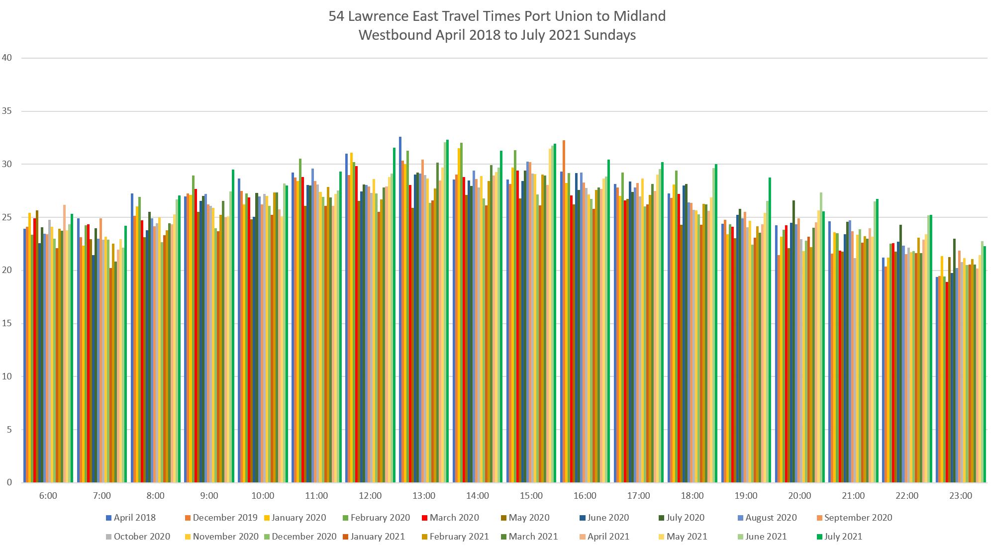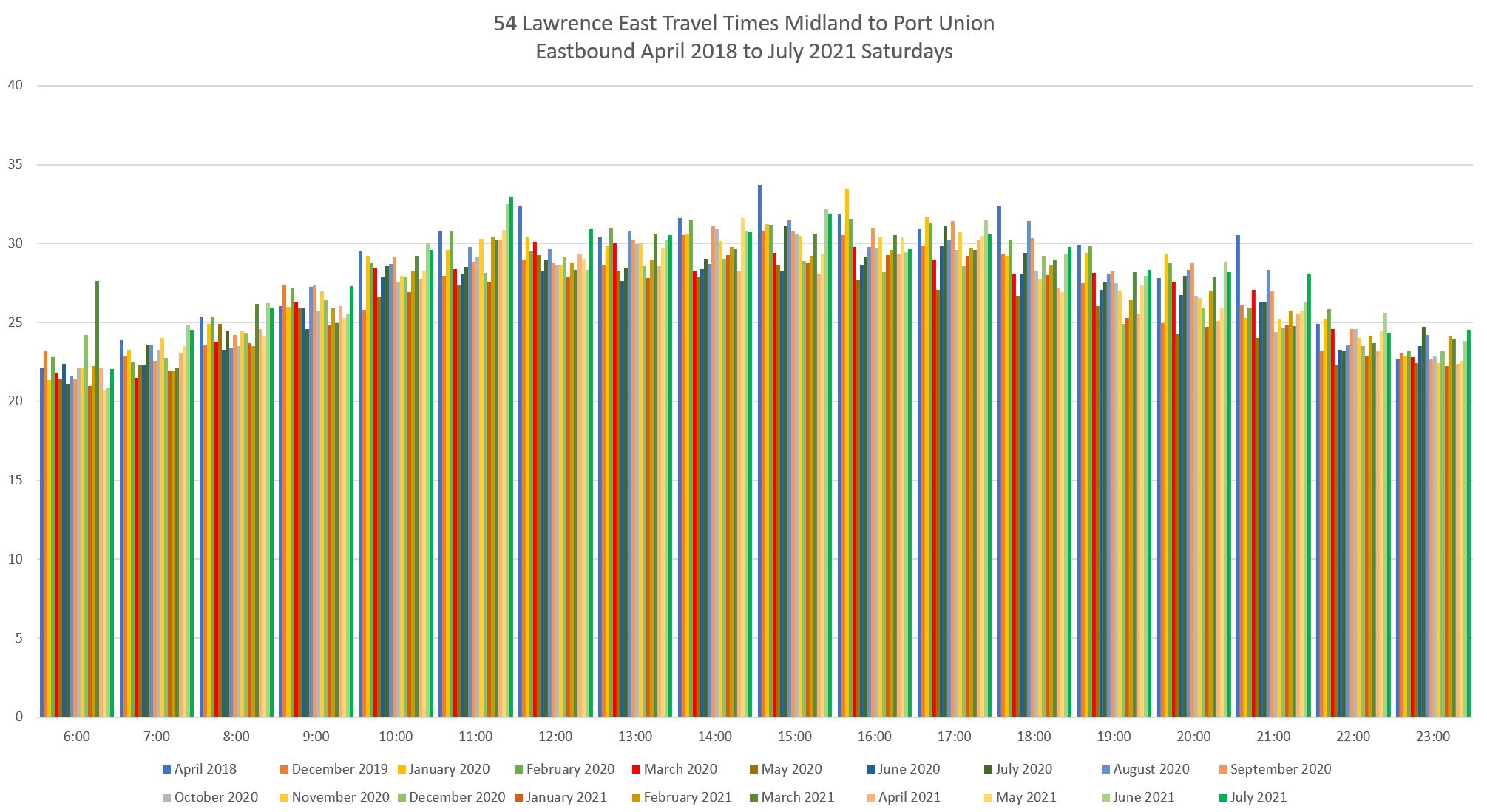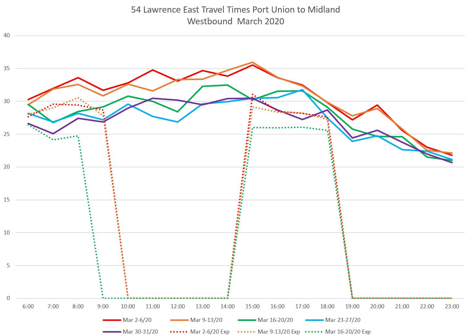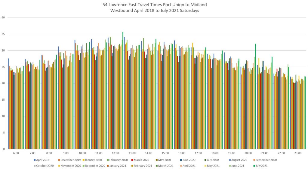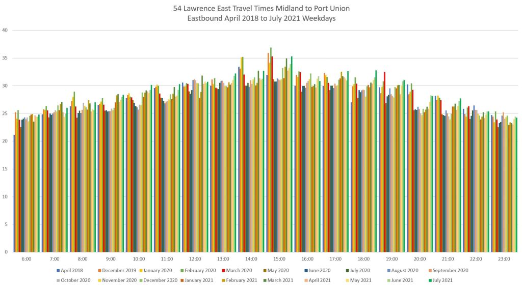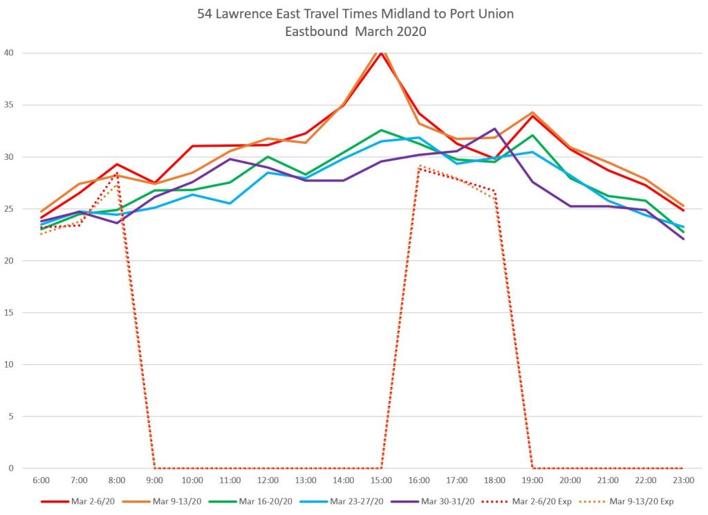 For the eastern part of the route, I have used screenlines at Midland, just east of Lawrence East Station, and at Port Union. Although buses are scheduled travel to Starspray, the location where they take layovers varies considerably and a screenline at that loop does not provide reliable travel times.
