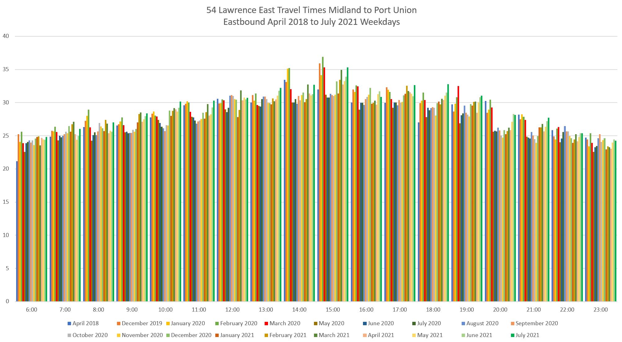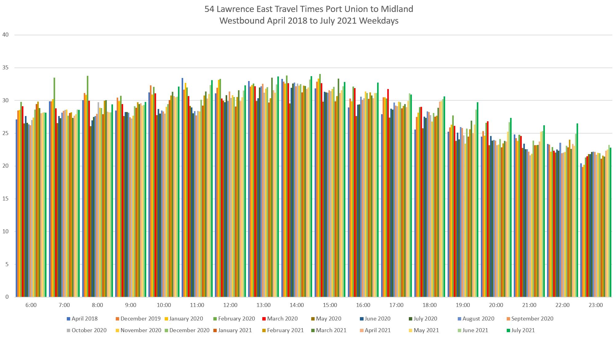 Note that these charts include travel times only for buses operating as 54 local service. The 954 express times are charted separately.