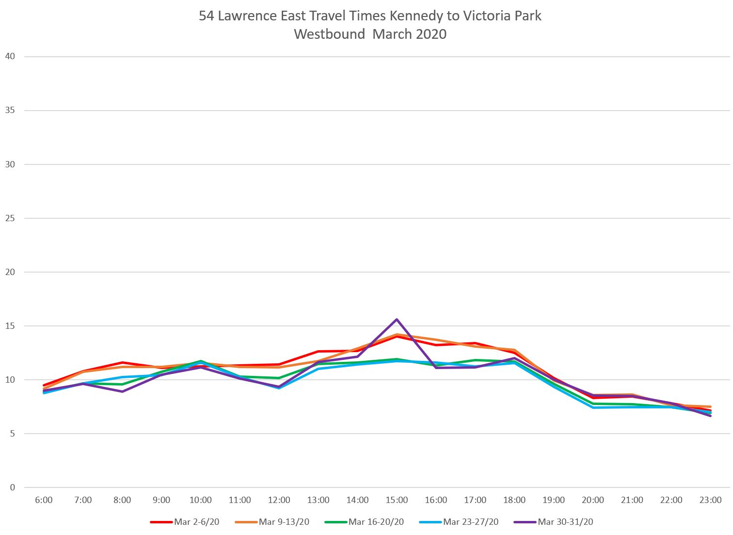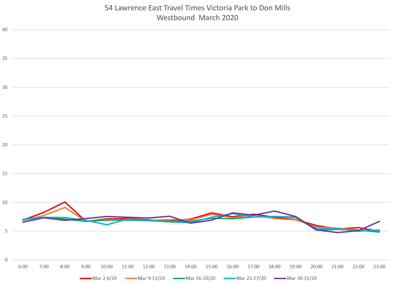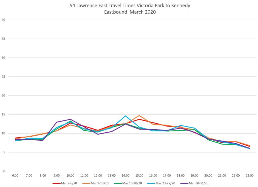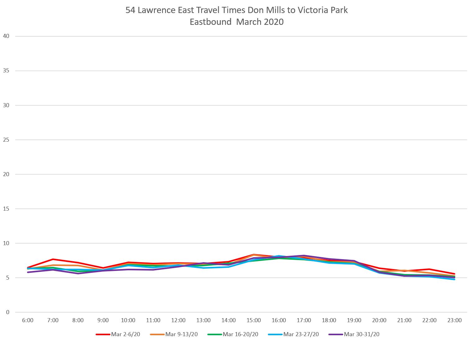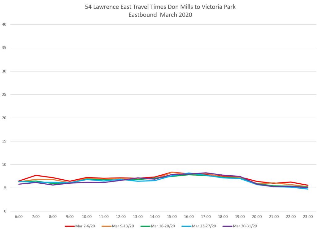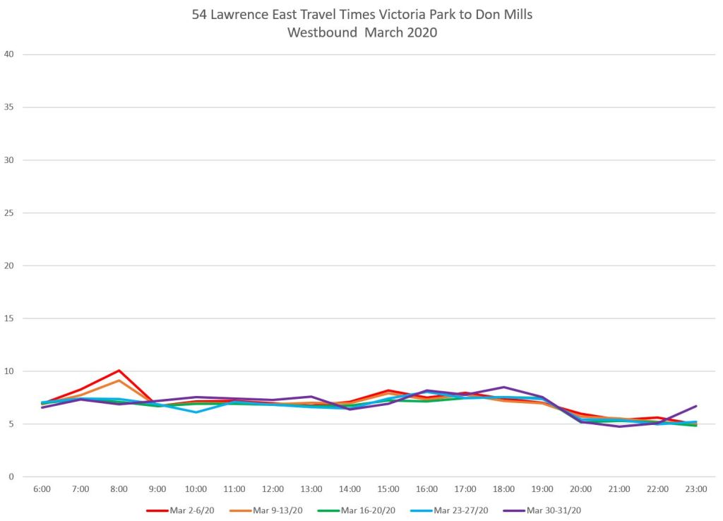 The reduction in travel times on Lawrence East from mid-March onward was smaller than on some other routes, and this was confined to certain areas and directions. This implies that red lanes would not offer much change during many periods over the route from Don Mills to Starspray as proposed.