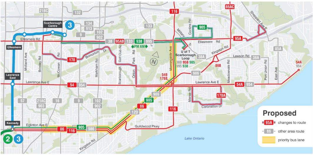 Major changes are proposed as part of the route reorganization for Line 5 Eglinton Crosstown’s opening in 2022 with service on both the 54 and 954 routes originating from Science Centre Station at Don Mills & Eglinton rather than at Eglinton Station.