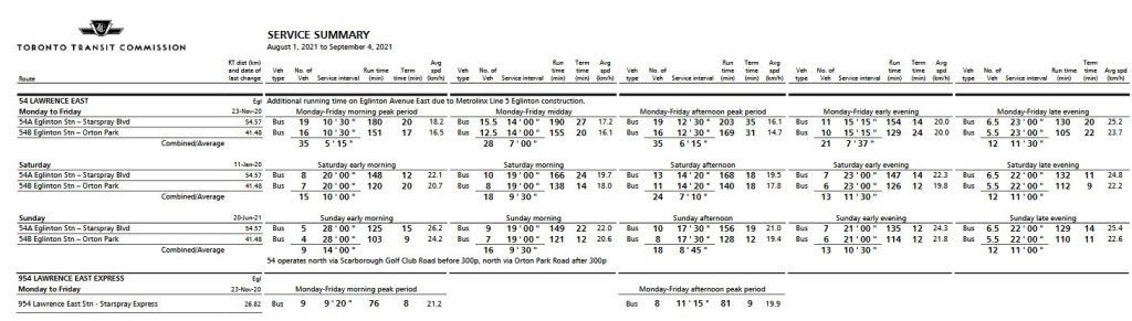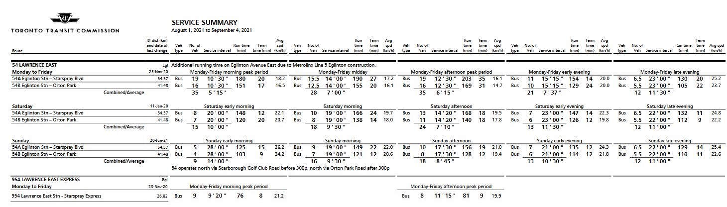 - 54A local service from Eglinton Station to Starspray Loop at the eastern edge of the city. This is one of the longest routes on the TTC network.