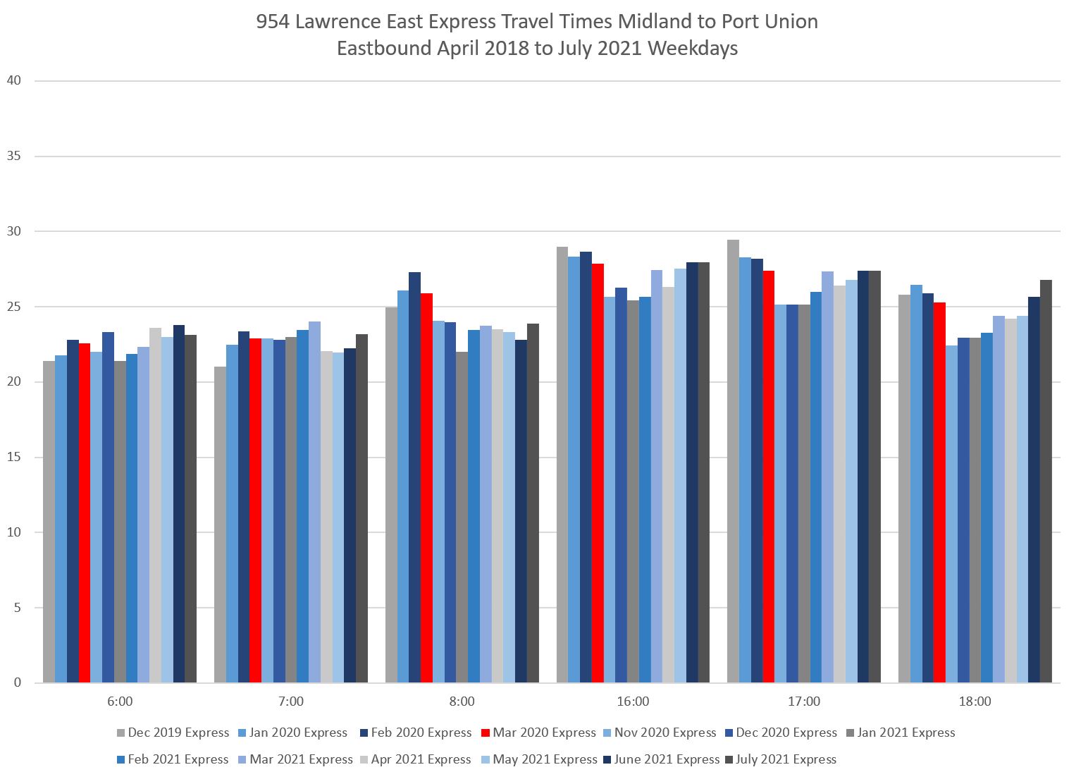 March 2020 saw the onset of the pandemic shutdown and decline in ridership. Travel times for weeks 1 and 2 were at historical levels, but they fell through the month to week 5. Express service was canceled after week 3. Note that the change in travel times was only modest, and as later charts will show, this saving was not long-lived.
