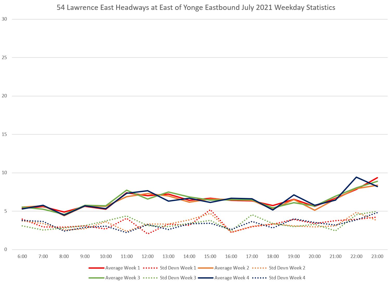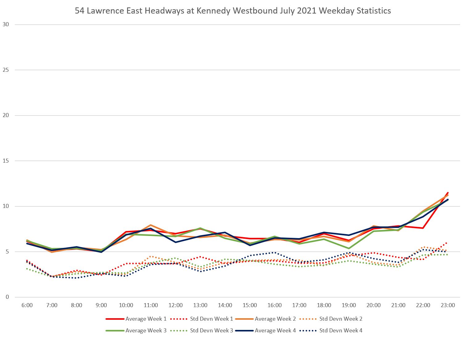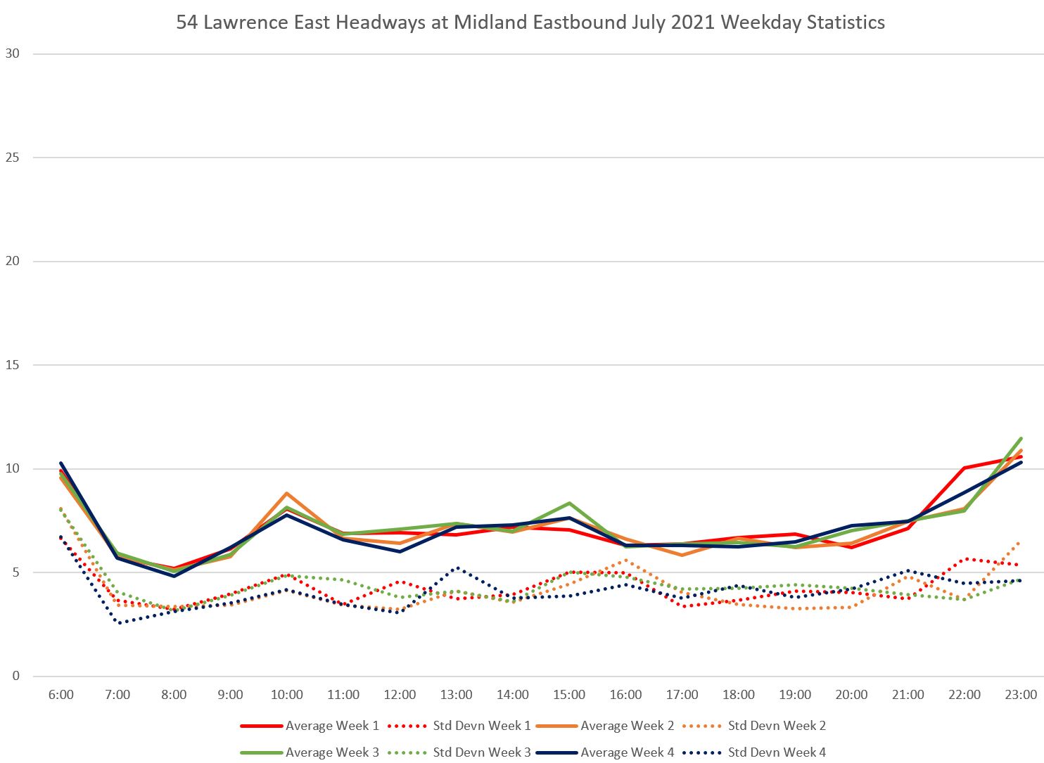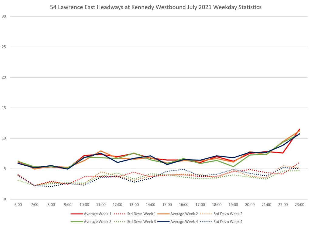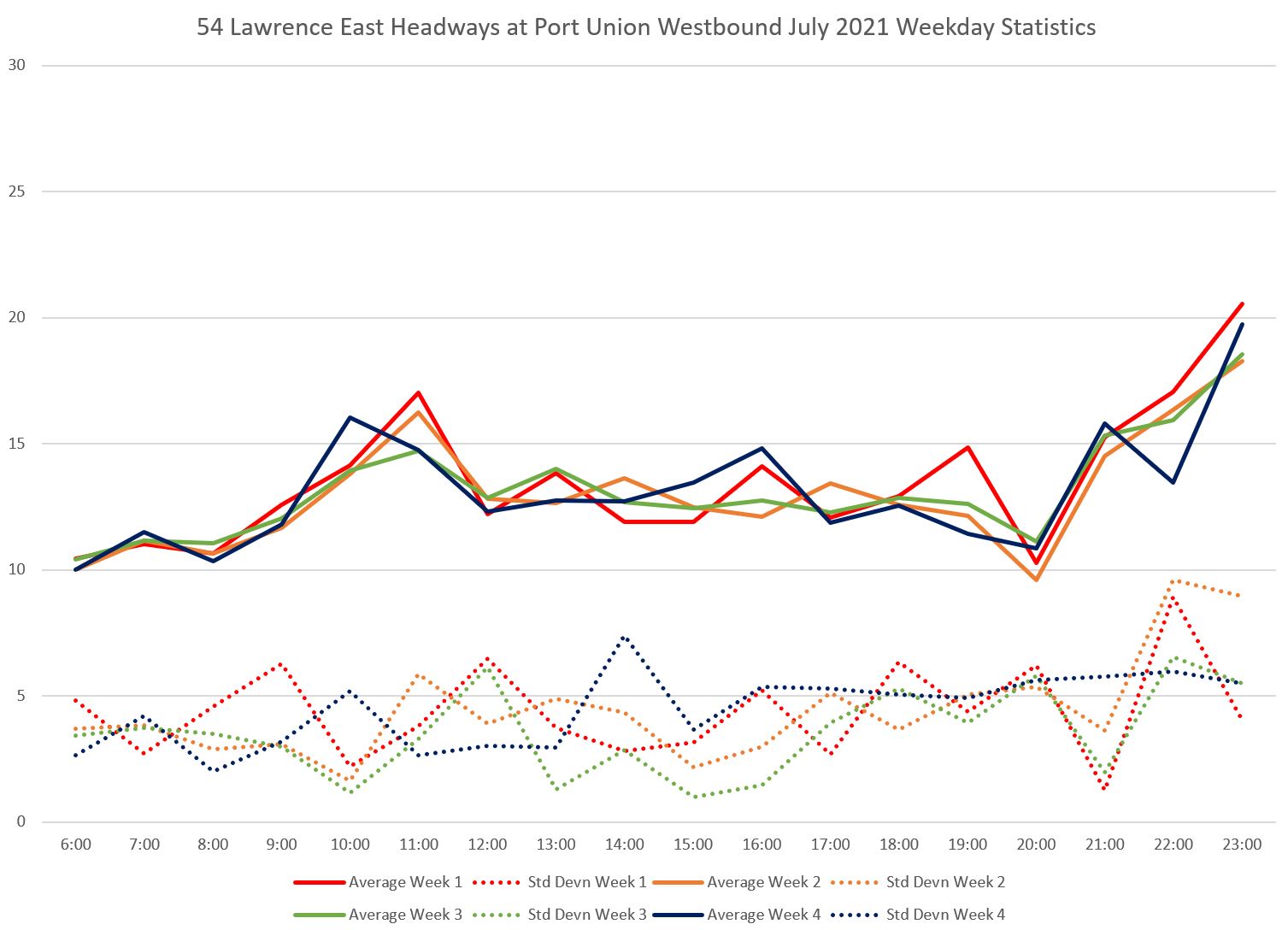 Within the weekly averages, note that the standard deviations (dotted) are high and they bounce around a lot. This indicates a wide swing in actual headway values.