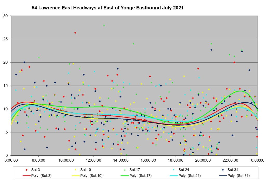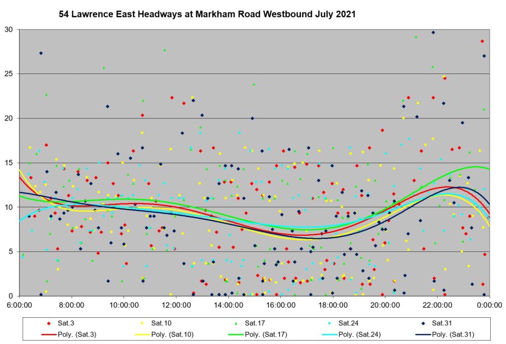 Headways inbound from eastern Scarborough are disorganized both at the very outer end, and west of the point where the 54B service merges in. The express service operates on wide-ranging headways to the extent that waiting for the next one to show up could add more to a trip than the time saved by “express” operation.