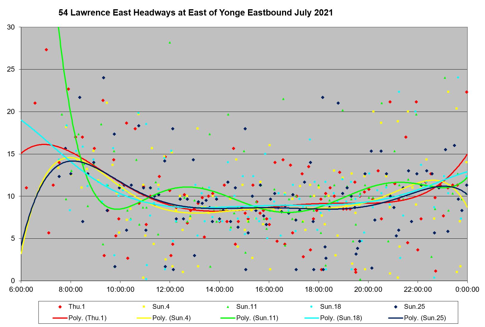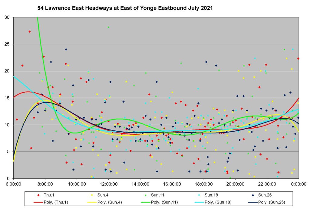 Service eastbound from Eglinton Station is actually somewhat better behaved than at other parts of the route. The standard deviation of headway values is not as close to the average and many of the data points are more tightly cluster around the trend lines.