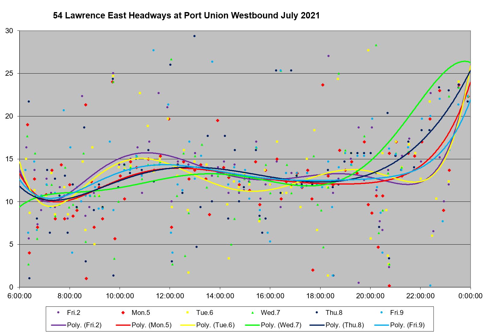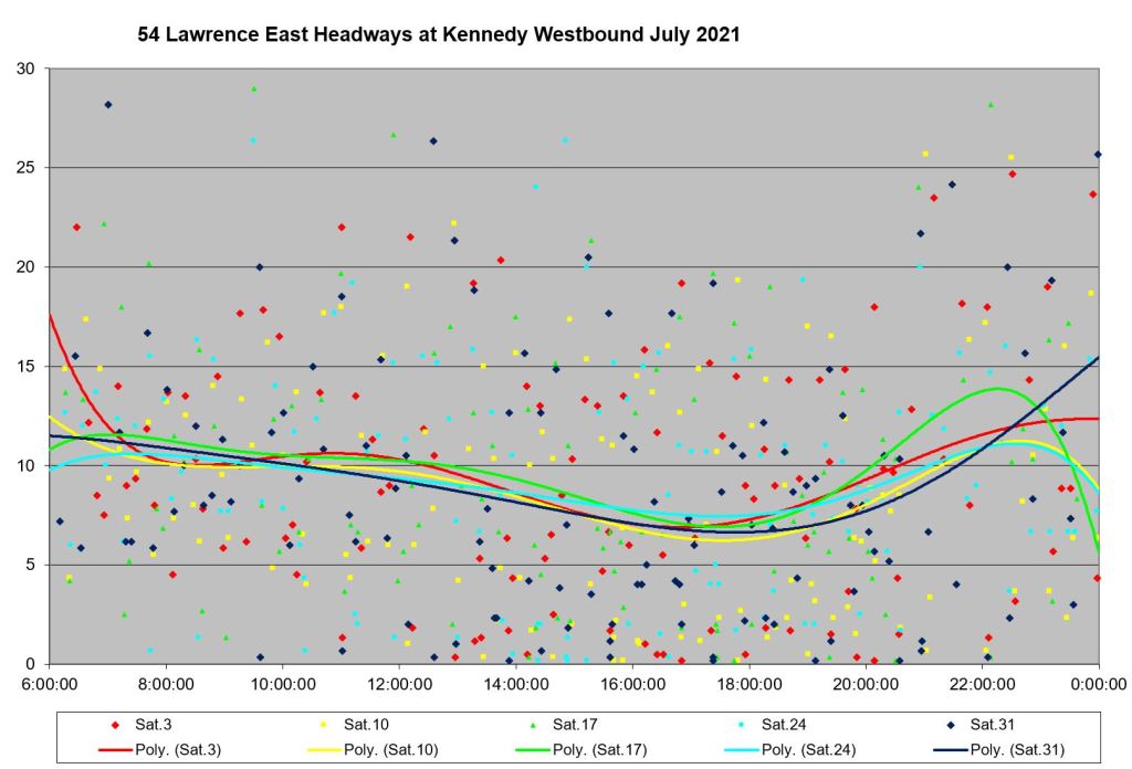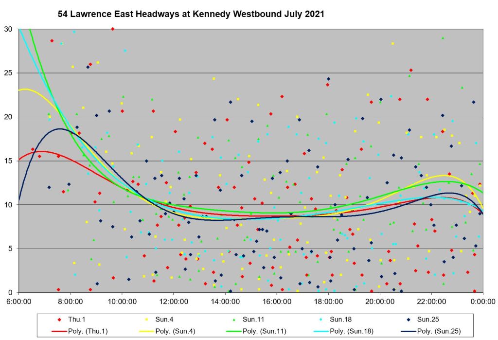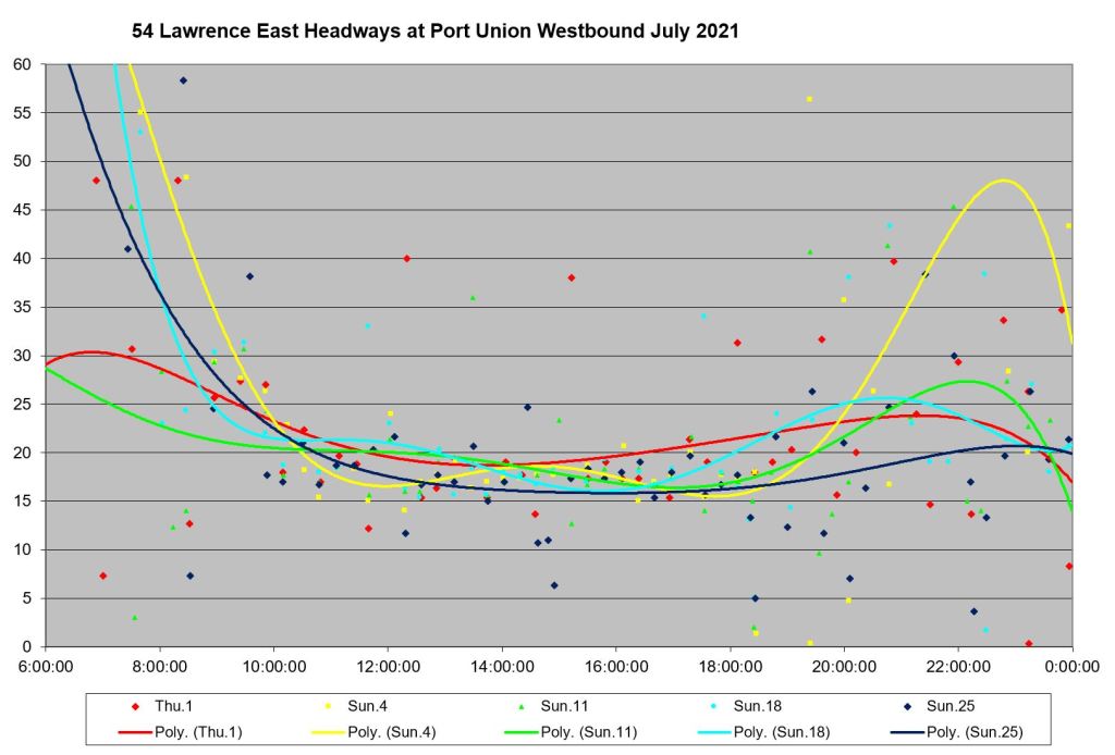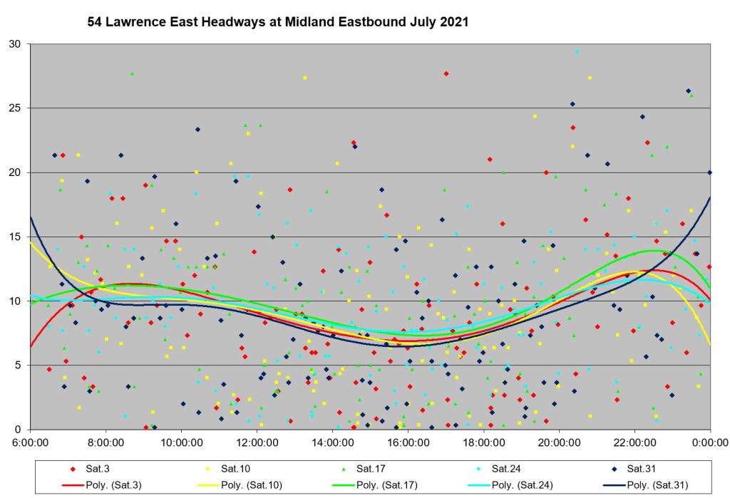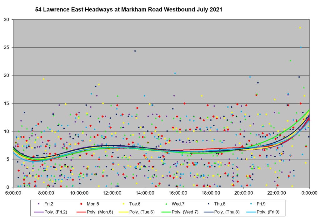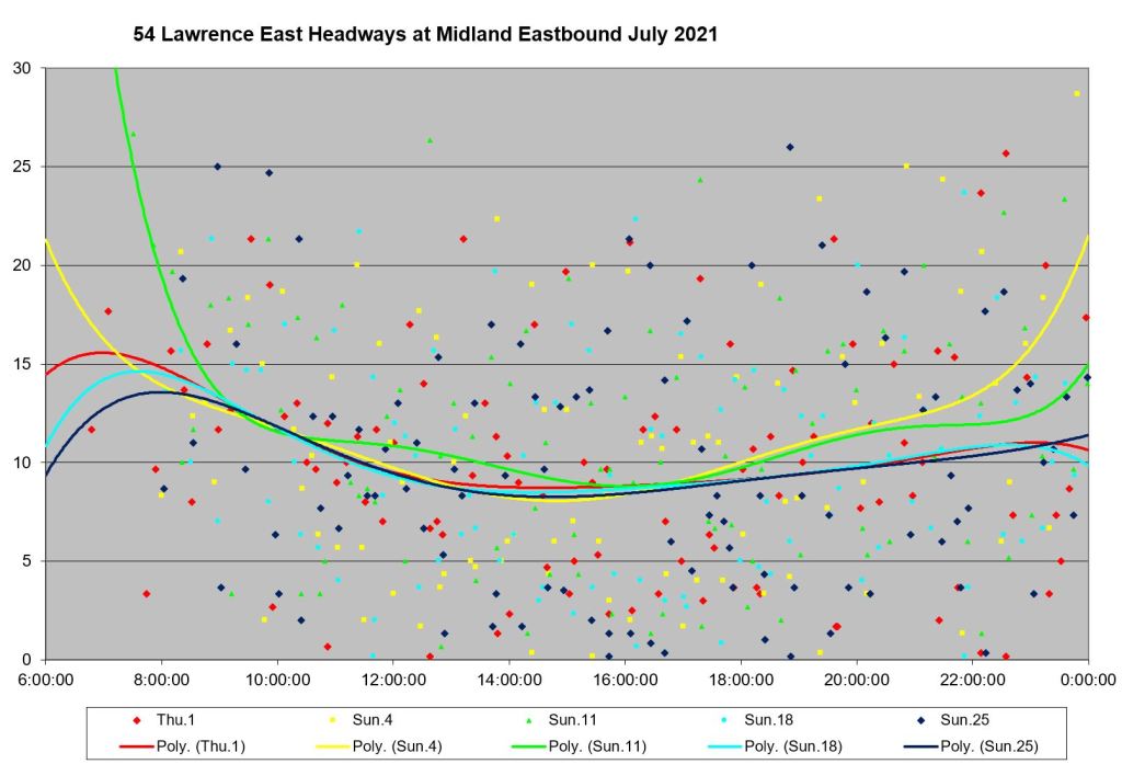 Looking at the period from July 2 to 9, one can see the combined effect of erratic service inbound from Starspray with the added departures from the Orton Park loop. The trend lines are very well-behaved, but they are surrounded by a cloud of data points ranging over a band from 0 to 15 minutes all day long.