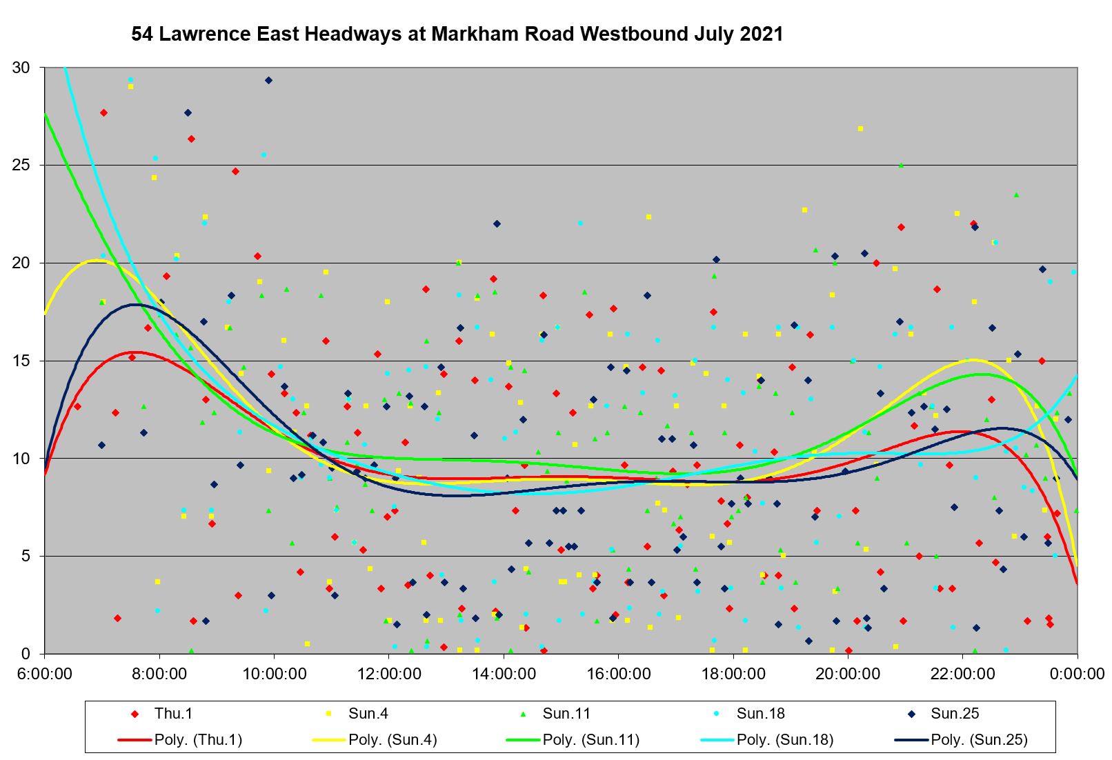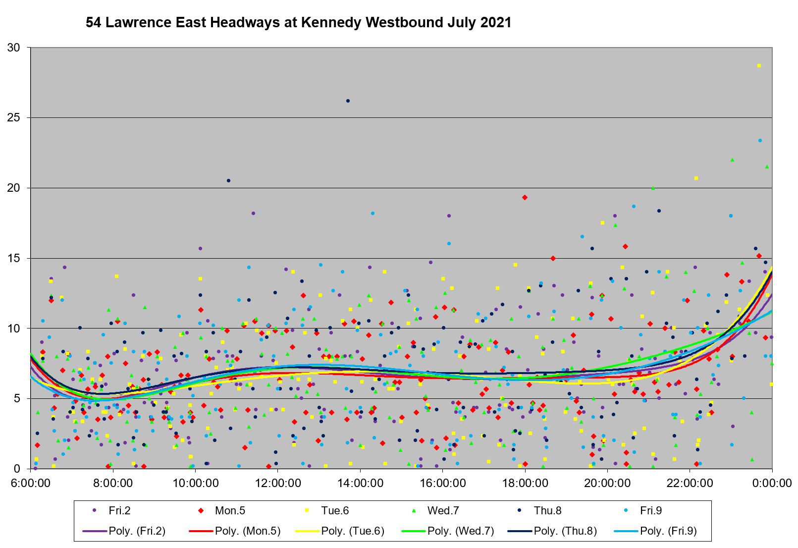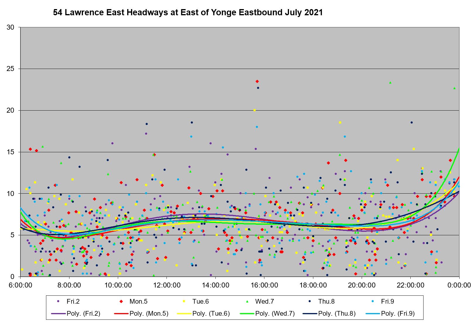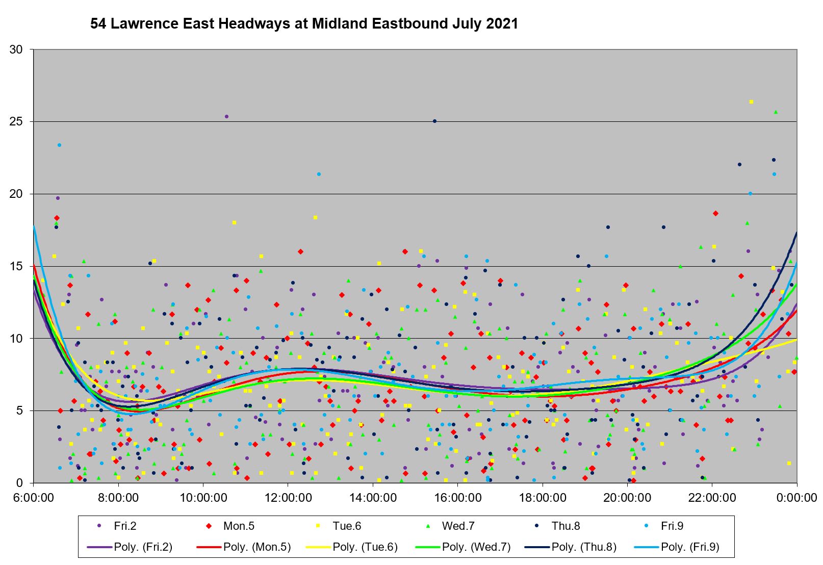 Looking at the period from July 2 to 9, one can see the combined effect of erratic service inbound from Starspray with the added departures from the Orton Park loop. The trend lines are very well-behaved, but they are surrounded by a cloud of data points ranging over a band from 0 to 15 minutes all day long.