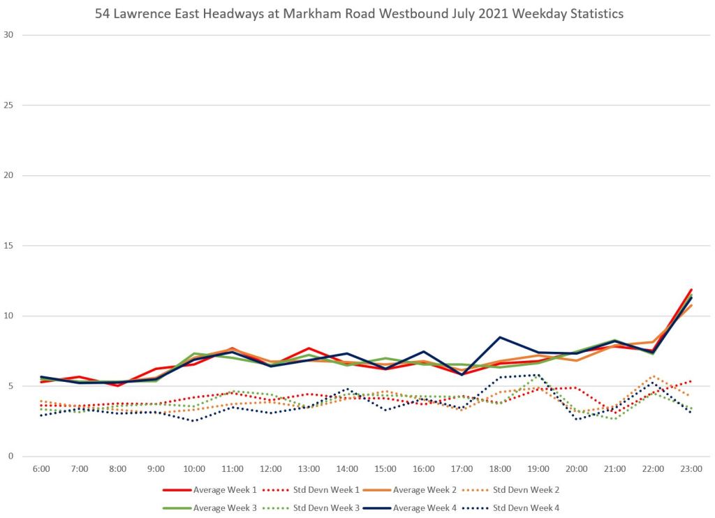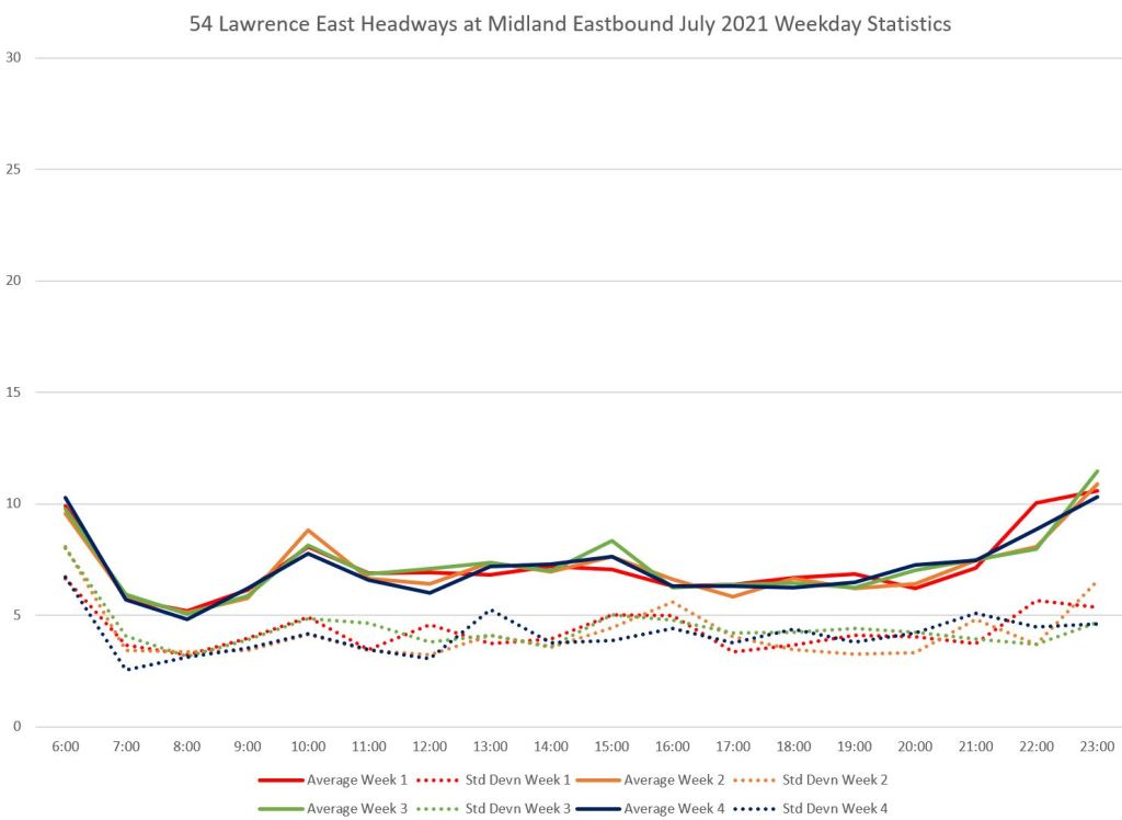 Eastbound at Midland, the standard deviation values lie at 4-to-5 minutes, fairly close to the average headway indicating a fair amount of bunching.