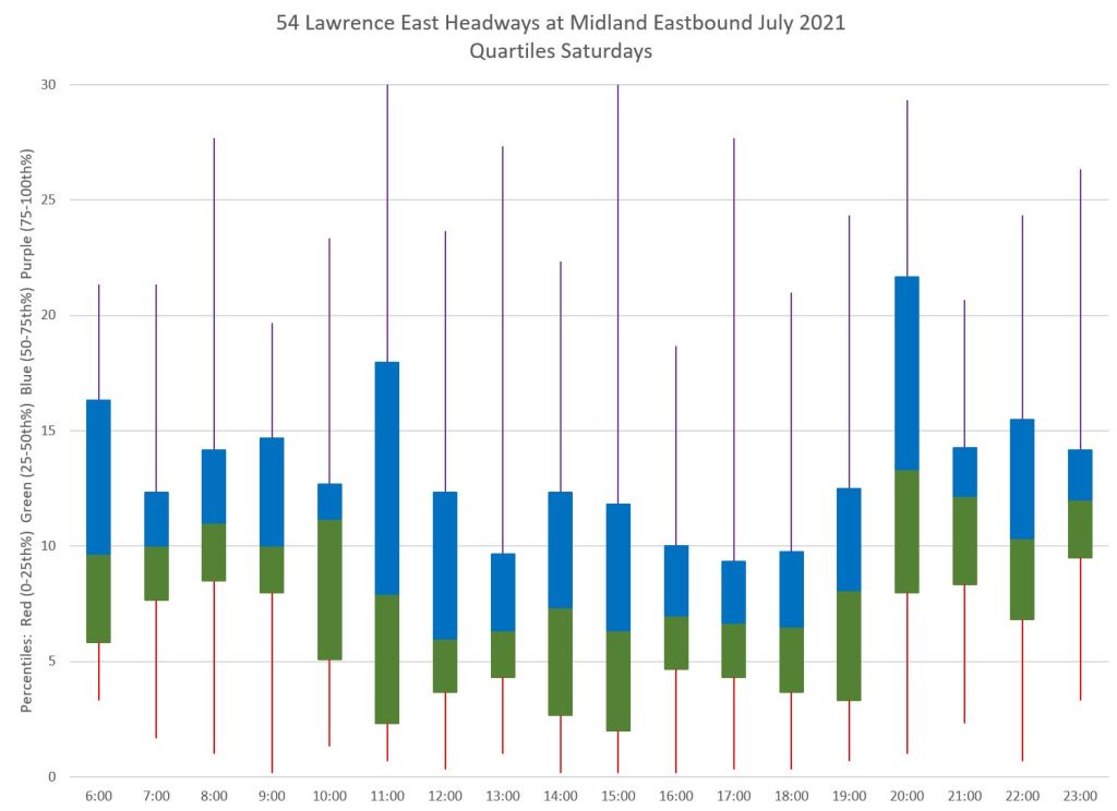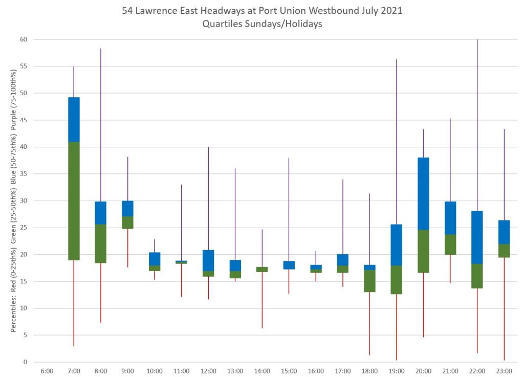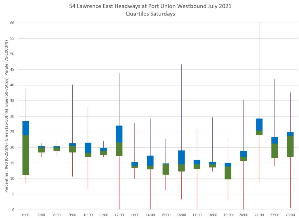 Another way to look at the data is by quartiles. The blue and green boxes contain the middle 50 percent of headways, while the red and purple tails contain the outlying values. Ideally one wants to see most values concentrated in the box, and for that box to be relatively small with short tails such as at 7, 8 and 11 am in the chart below. Long tails are a sign that half of the service (the 1st and 4th quartiles) are spread over a wide range of values. This can occur even when the central quartiles are in a small range.