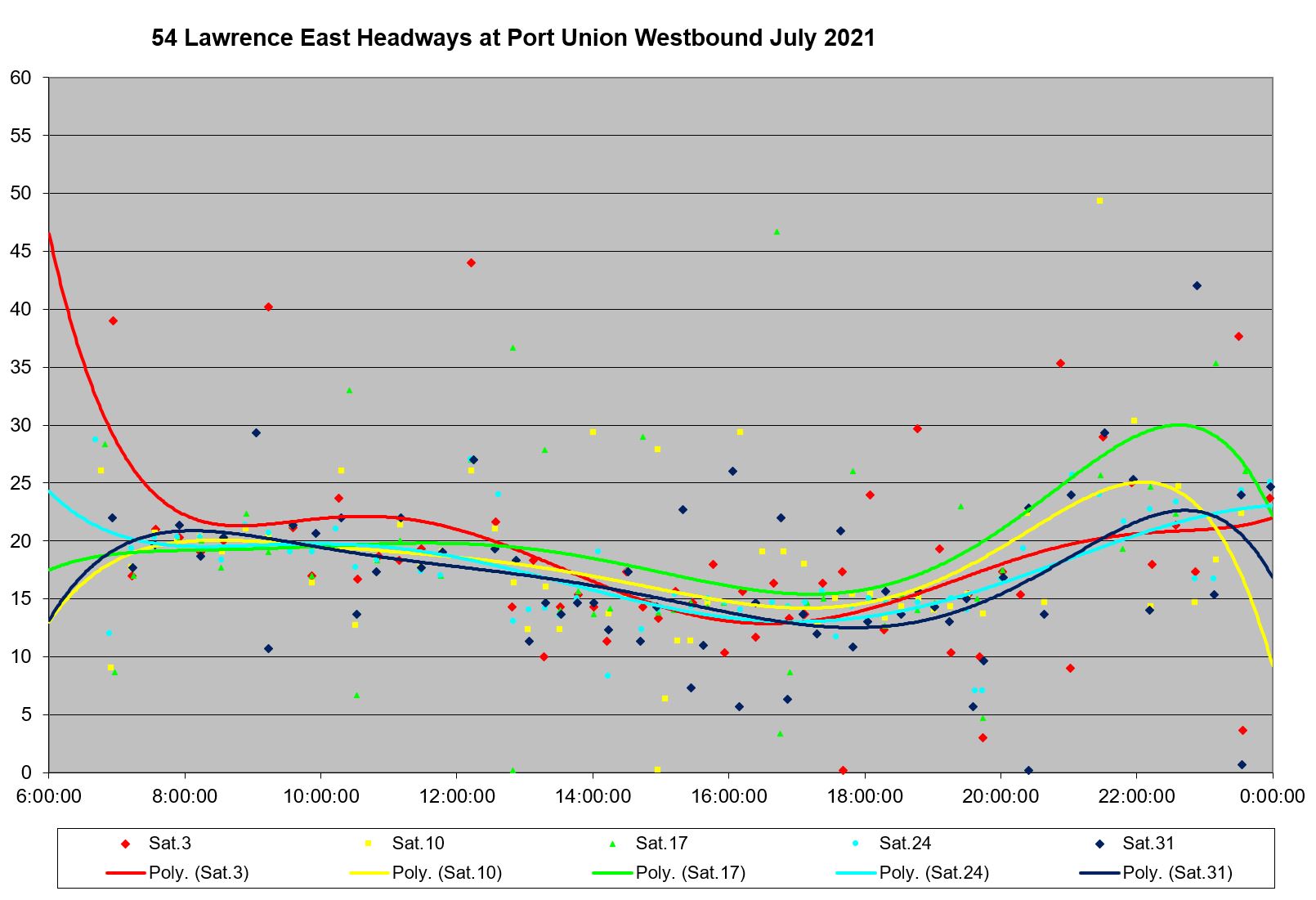 Saturday and Sunday service included enough very wide gaps that they are plotted with a y-axis up to 60 minutes rather than the 30 minutes used for other charts in this section. This is a clear example of service that lies well outside any conceivable target either for “on time performance” or reliable headways.