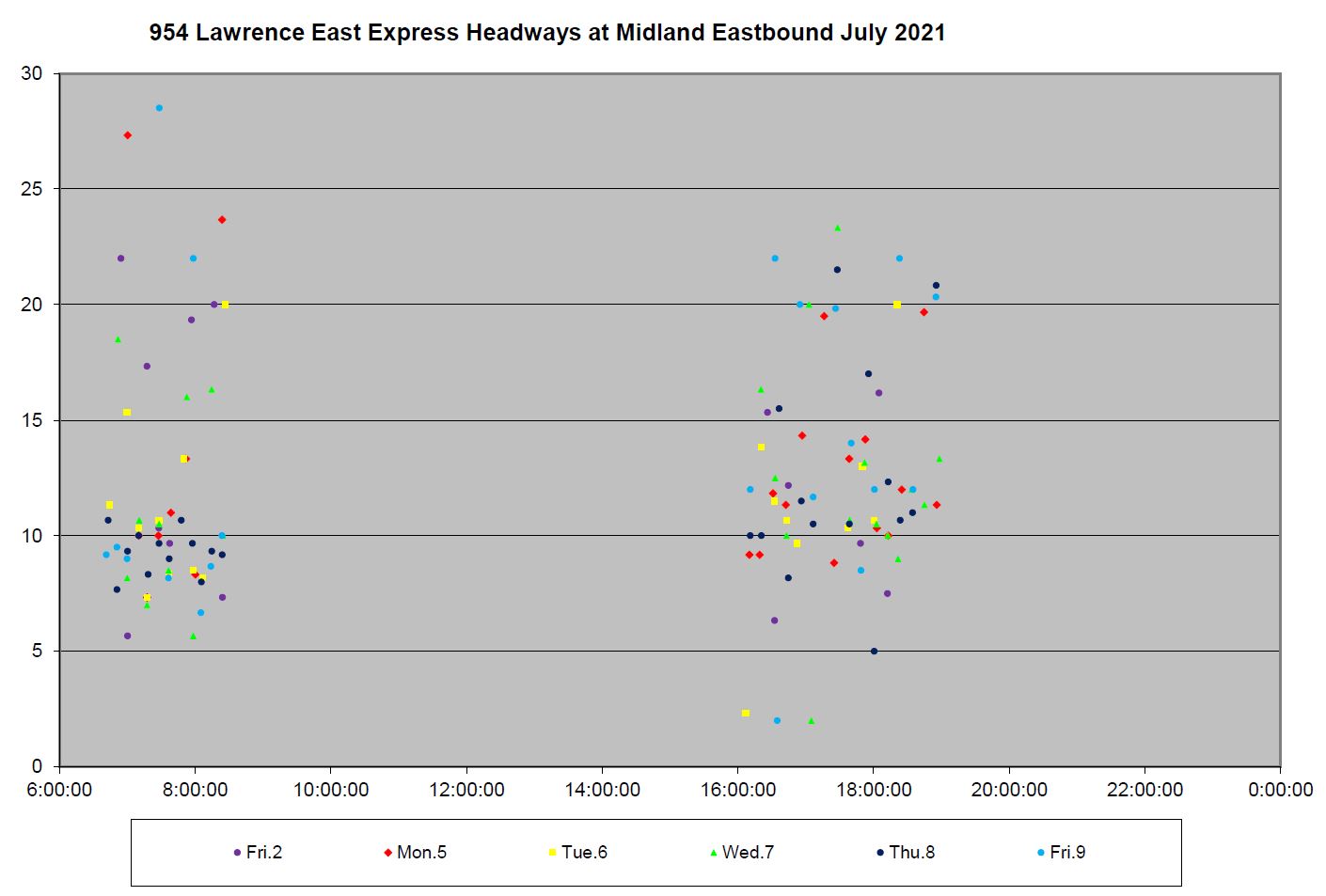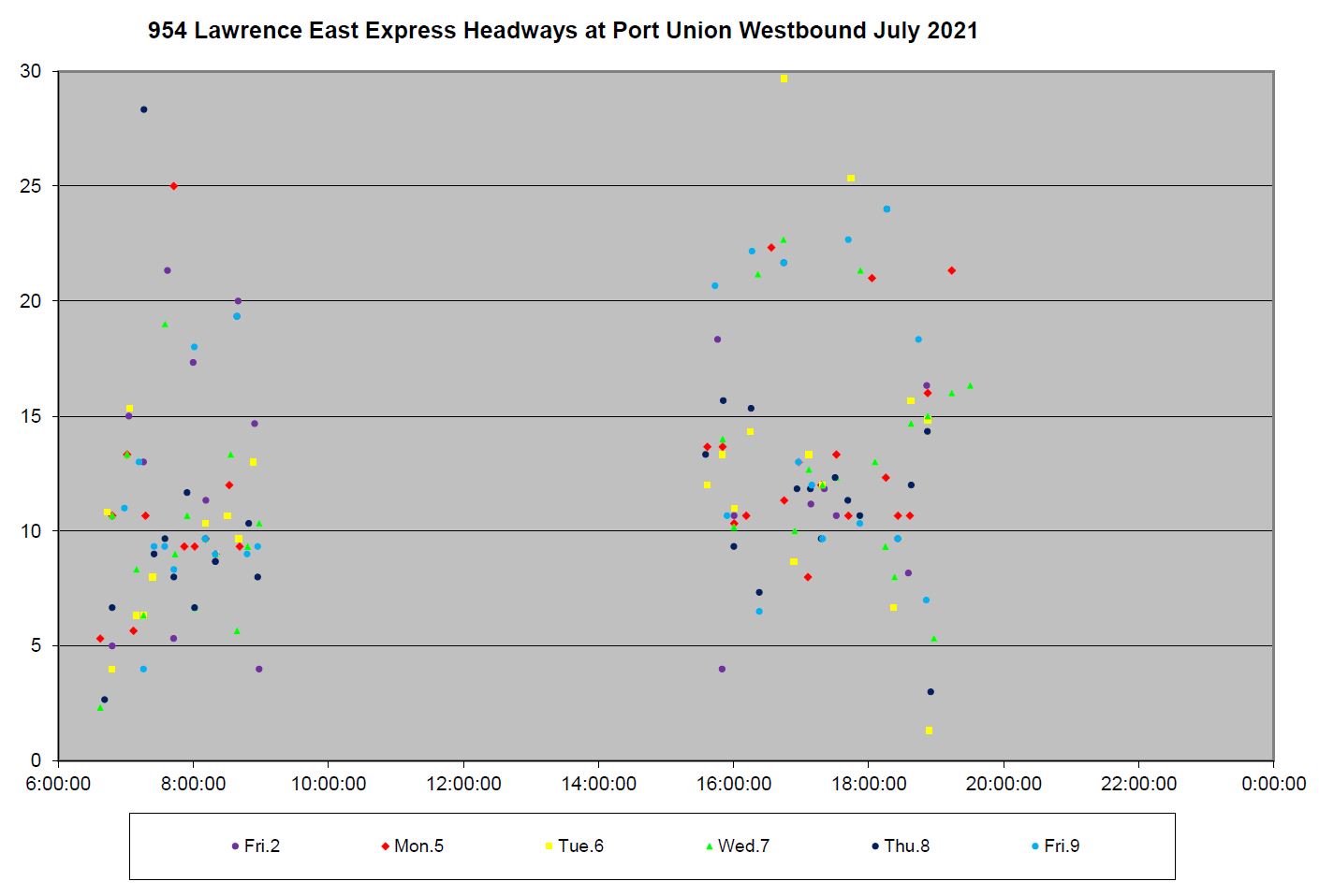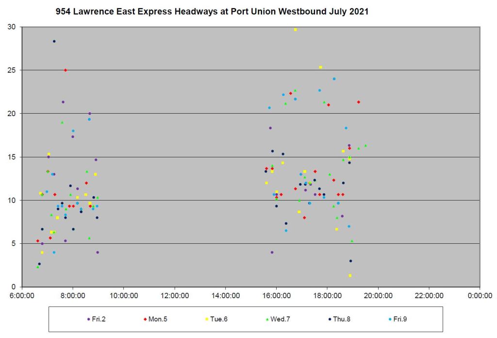 The express service, in spite of operating only on the portion of the Lawrence route not affected by construction, has extremely erratic headways. Here are the data for July 2-9 westbound at Port Union. The values are so badly scattered that any time saving possible with an express bus will easily be negated by the unpredictable wait time for one to appear.