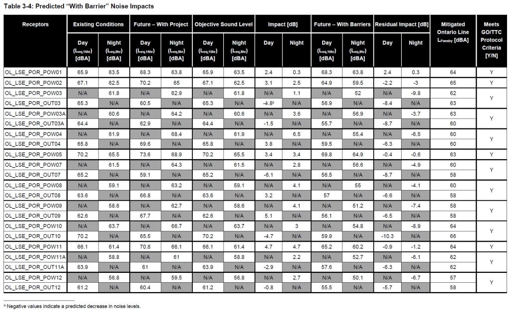Metrolinx claims that the noise barriers will reduce noise levels by up to 10dB on average or roughly by 50%. This is true only in two of the modeled locations. A mixture of smaller reductions and increases is shown in the detailed breakdown of model results. (See the section about Noise & Vibration study details at the end of the article.)