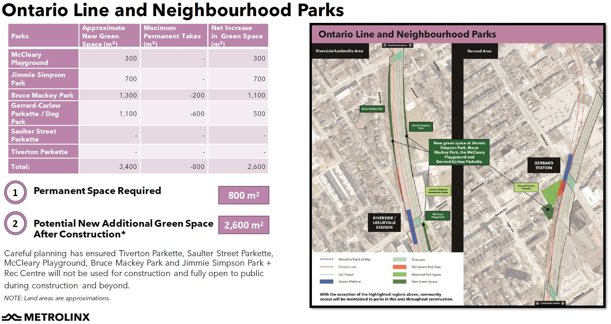 Metrolinx is sensitive to criticism that they will reduce green space in the corridor, primarily by removal of trees. They counter by pointing out that some parkland will be expanded following completion of the project.