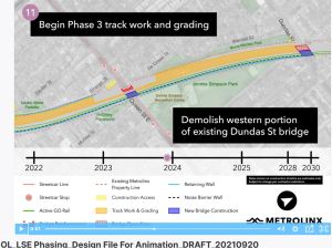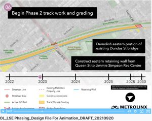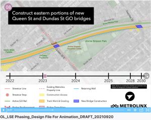 - Replacement of the existing rail bridges at Queen Street East, Dundas Street East and Logan Avenue;