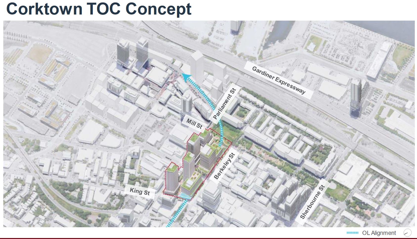 Steve, the diagram labelled Corktown TOC Concept shows the route extending south from the station, then curving under Parliament Square Park, and proceeding under(?) the scenic brick-lined pathway in the Distillery district. That pathway is wide, for a pedestrian pathway, but narrow for a subway right of way.