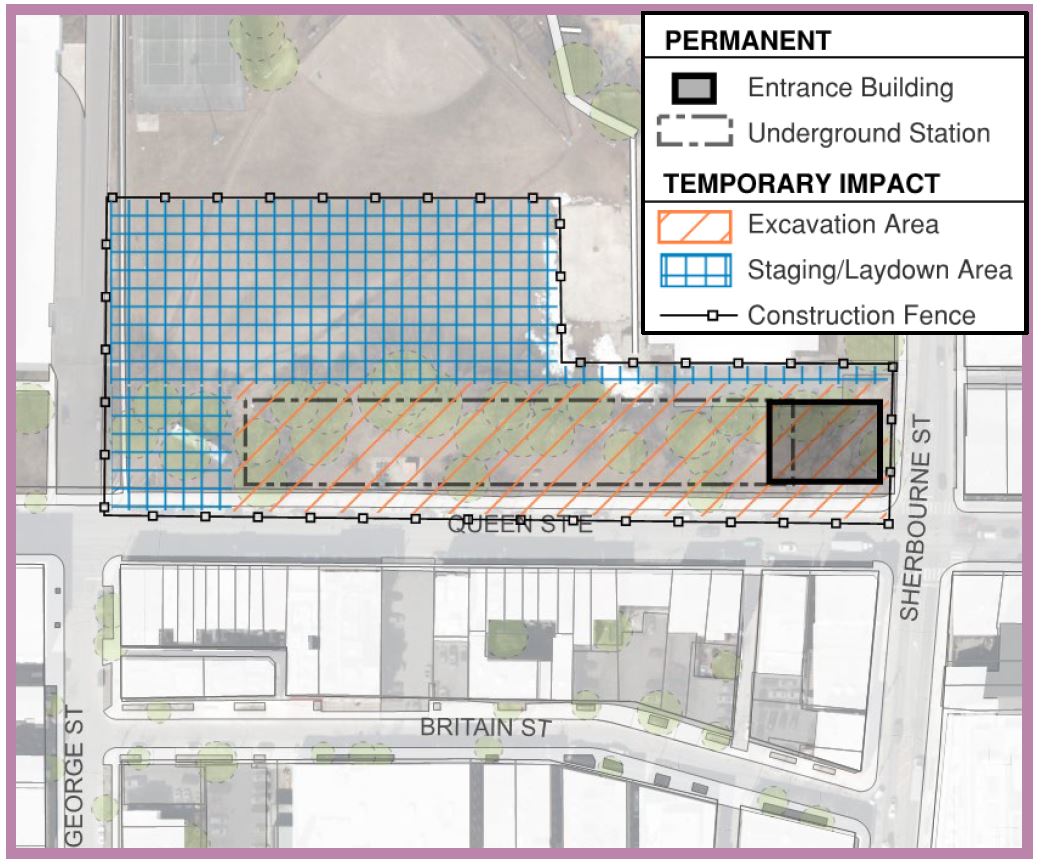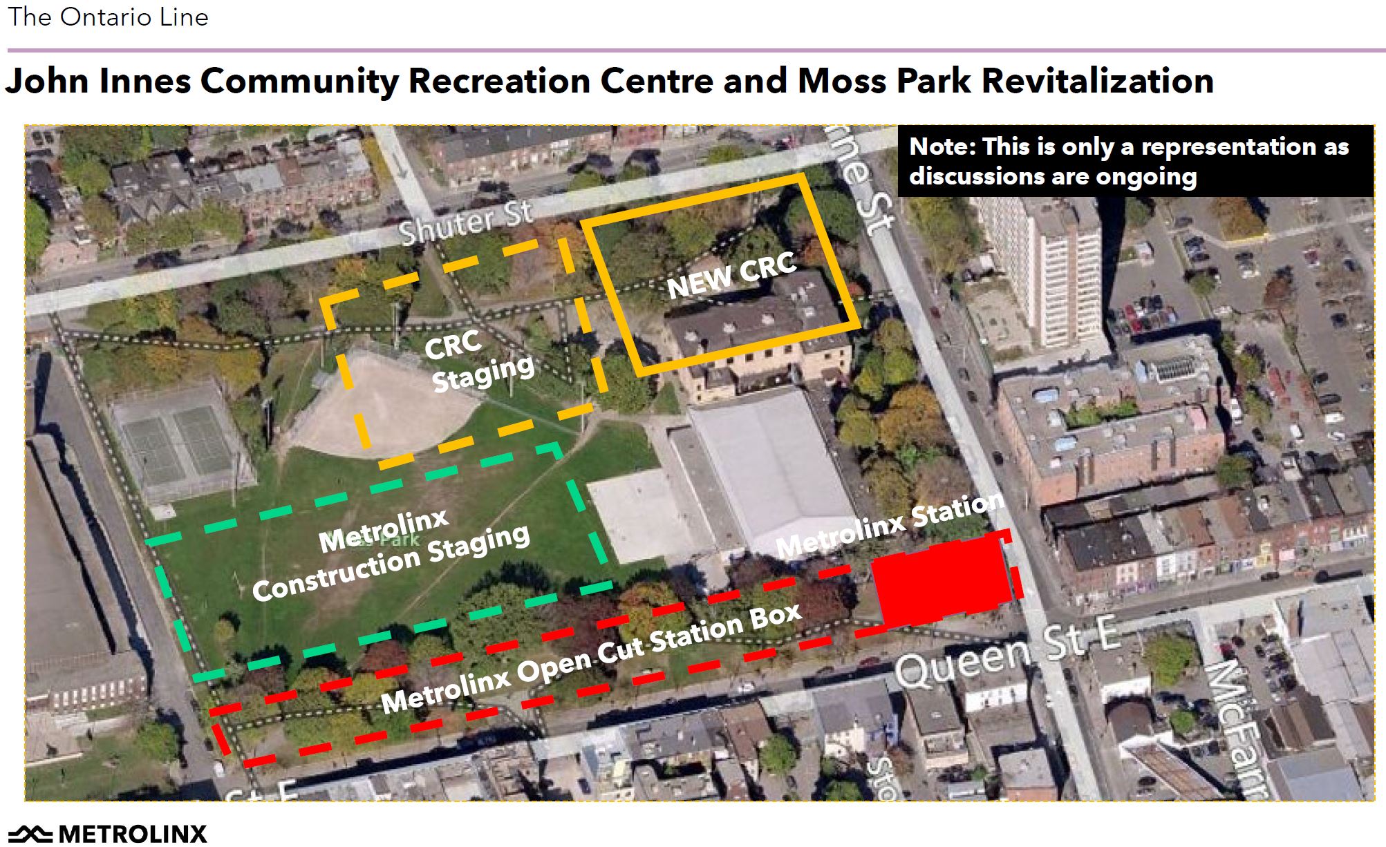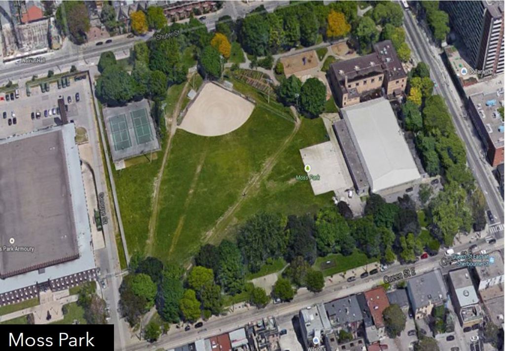 Moss Park is now a large green space with an arena and other community facilities. The station is planned to be a cut-and-cover structure in the area now occupied by trees along the north side of Queen Street west of Sherbourne. According to Metrolinx, an arborist’s survey for the Relief Line South indicated that many of these trees were in poor condition.