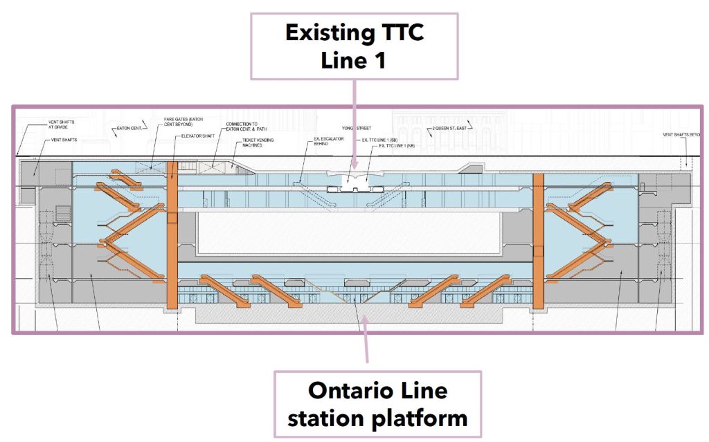 Despite its depth, Metrolinx claims that transfers with Line 1 Yonge will be faster than in the Relief Line South proposal because the City Hall Station on the RLS was located well west of Yonge Street.